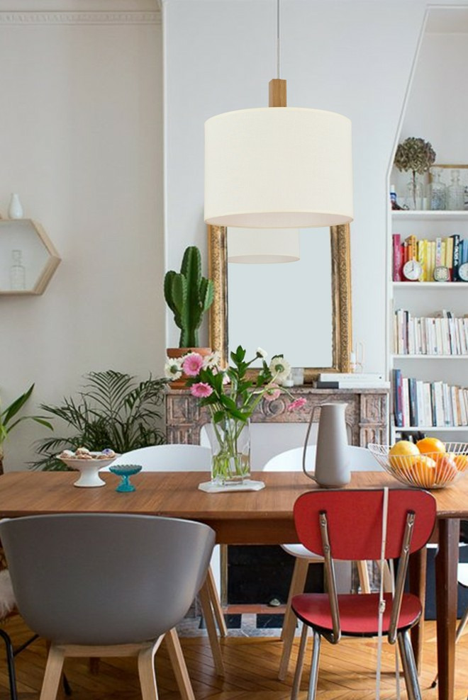 La suspension LILA et son abat-jour cylindrique en tissu écru créeront une ambiance chaleureuse et cosy dans votre pièce. Cette suspension classique également habillée d'un décor en finition chêne naturel conviendra parfaitement à une chambre ou à un hall de réception. Retrouvez dans la même gamme la lampe de chevet, la lampe de bureau,le lampadaire et l'applique chevet.