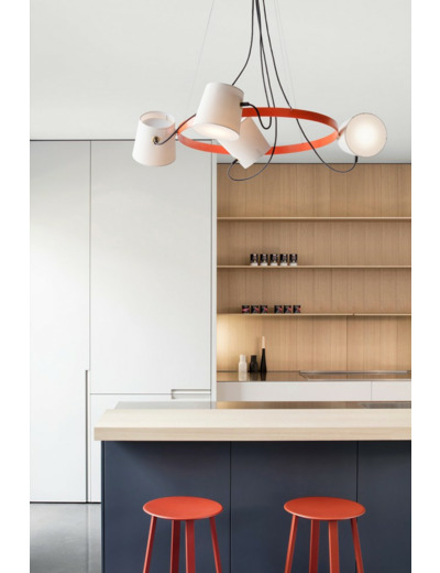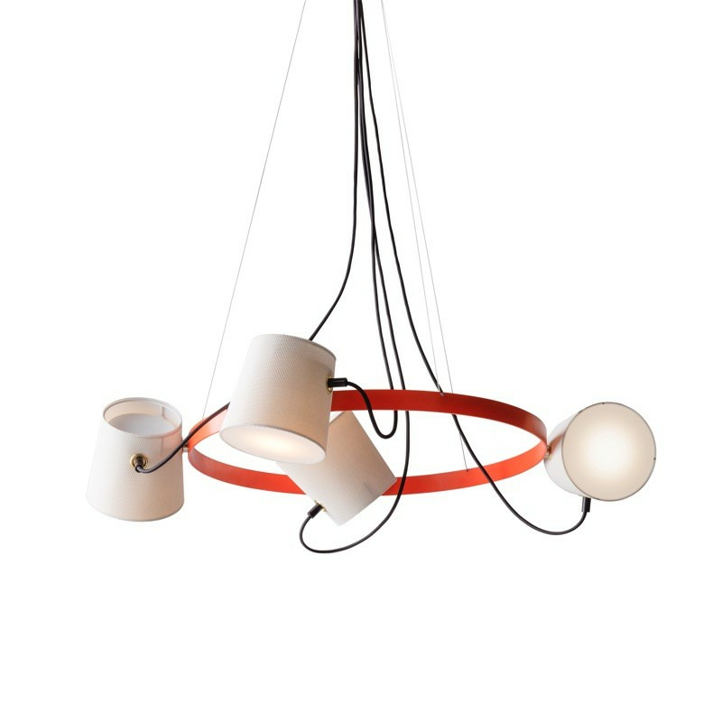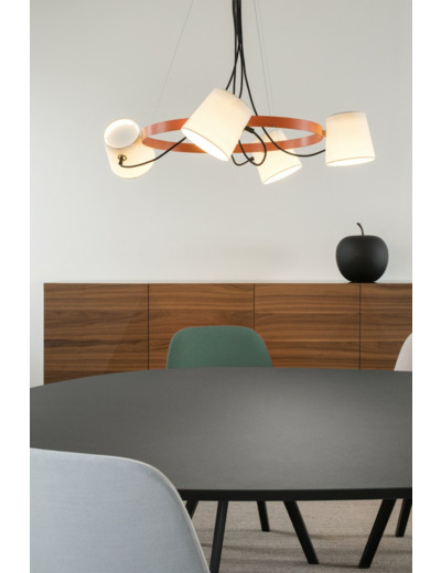 Ce lustre reprend les codes classique tout en apportant une touche contemporaine avec son anneau cuivré central. Les abat jours sont fixés sur l'anneau grâce à un astucieux système d'aimant et peuvent être orientés à votre guise de manière ludique.