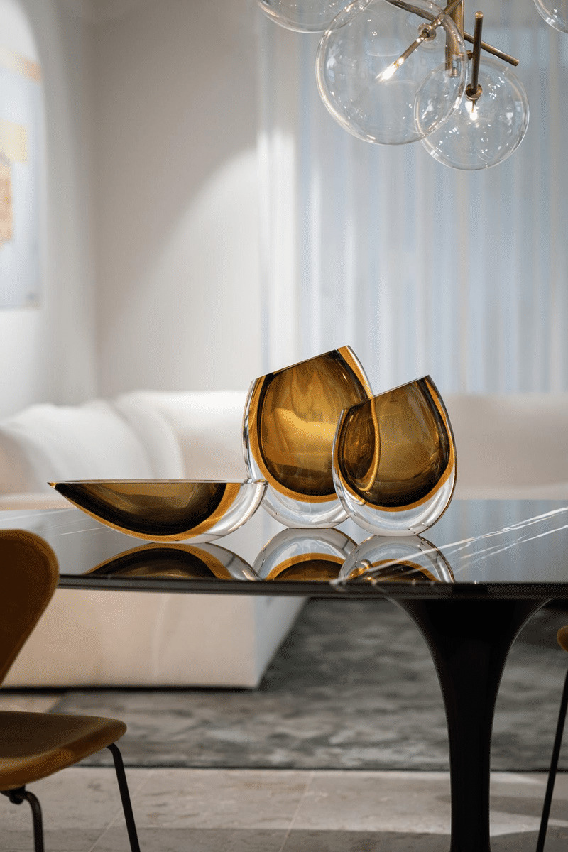 Vases bicolores soufflés à la bouche et conçus par Seguso, produits à Cà d'Oro au Brésil, dans un studio de fabrication de verre familial. Des lignes épurées, une forme minimaliste et un motif bicolore en font LES vases et offrent une touche d'élégance parfaite pour espace moderne.