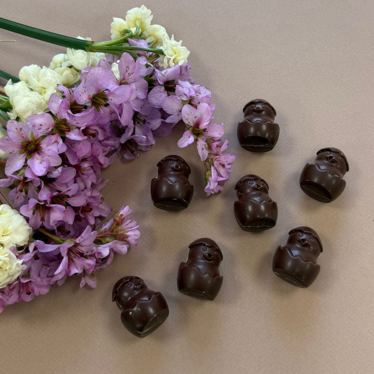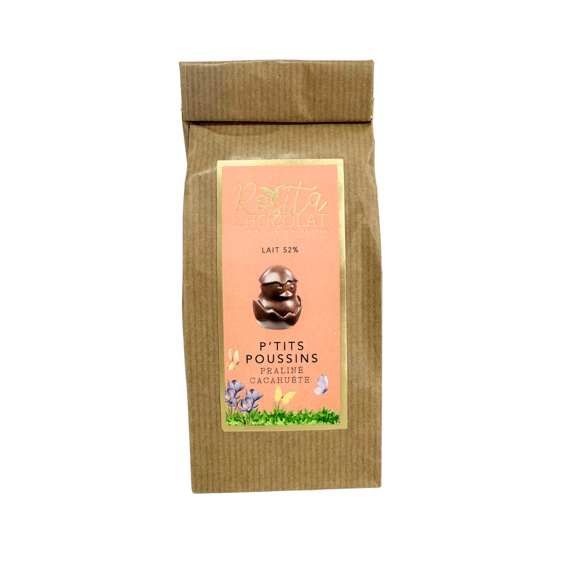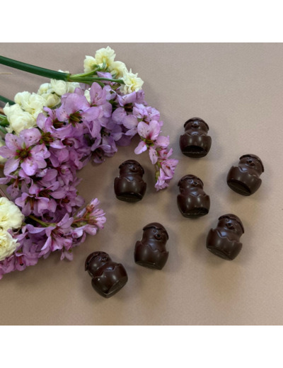 10 p'tits poussins fourrés praliné cacahuète légèrement croustillant à partager ou à savourer en cachette...En chocolat lait Sao Tomé, il révèle des notes gourmandes de chocolat intense et de cacao torréfié pour le plus grand plaisir des papilles.
