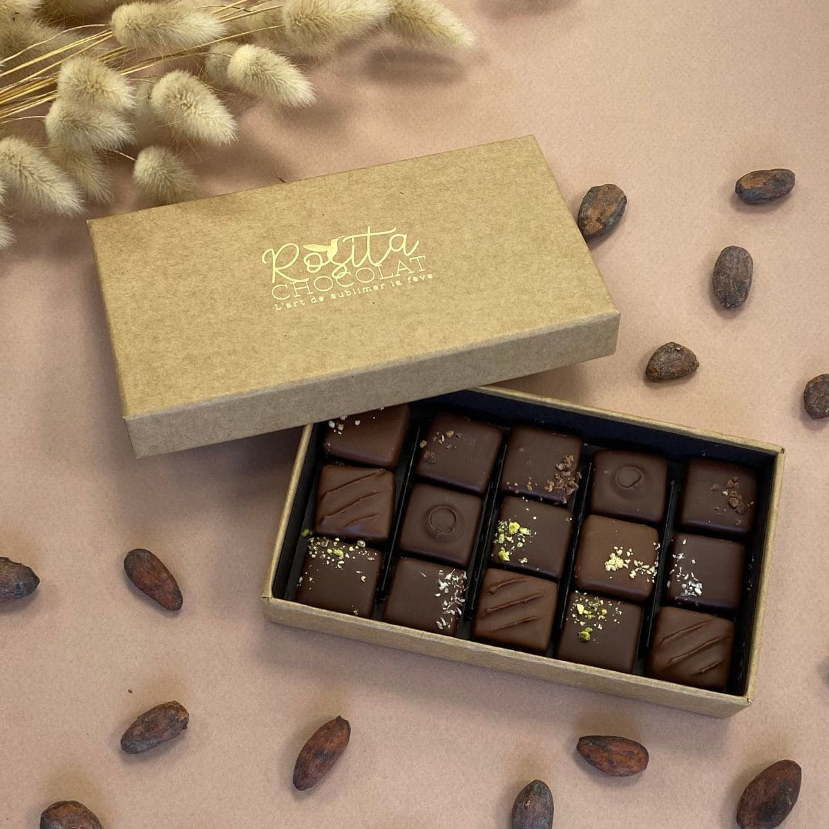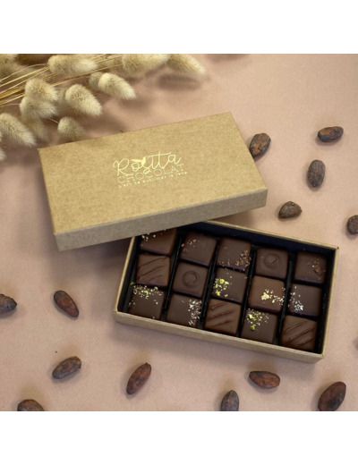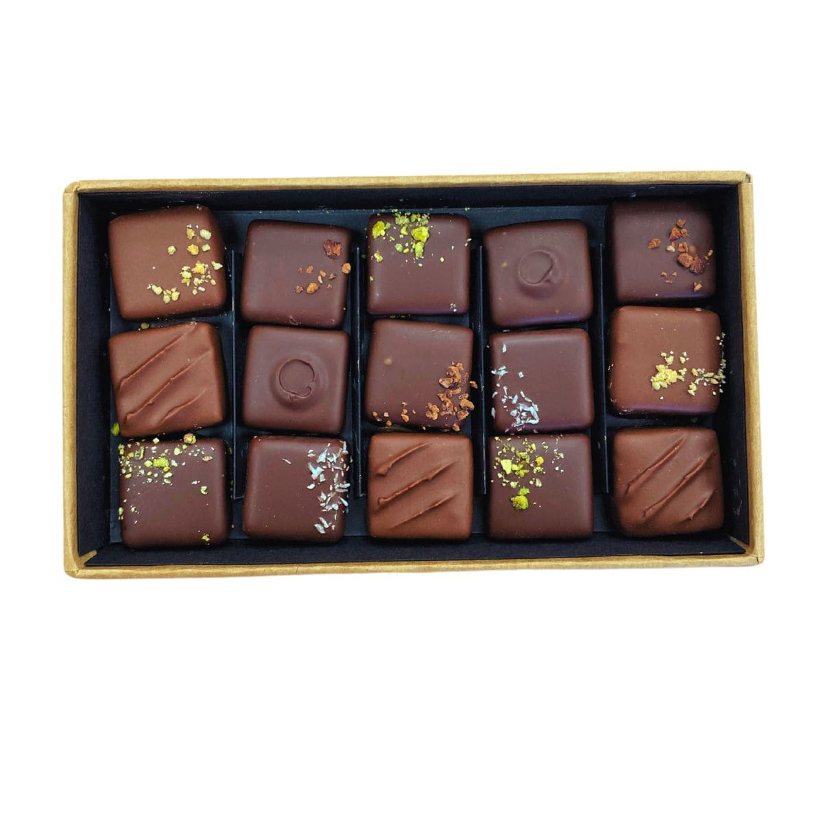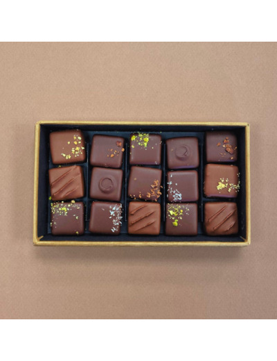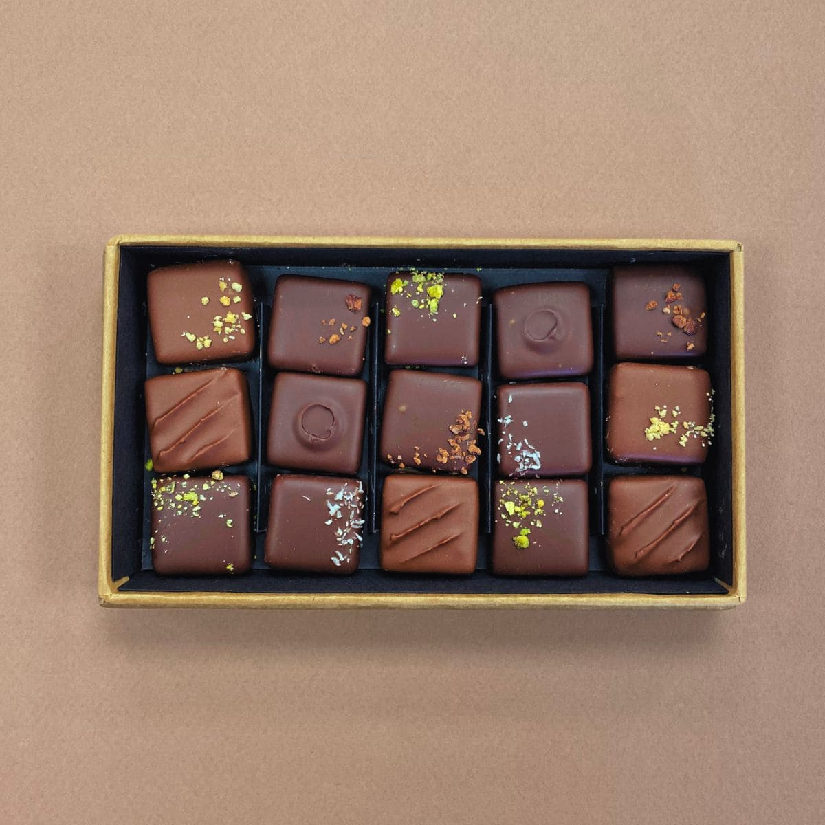 15 bonbons pralinés avec un enrobage chocolat Palo Santo Équateur et un praliné légèrement croustillant en bouche.