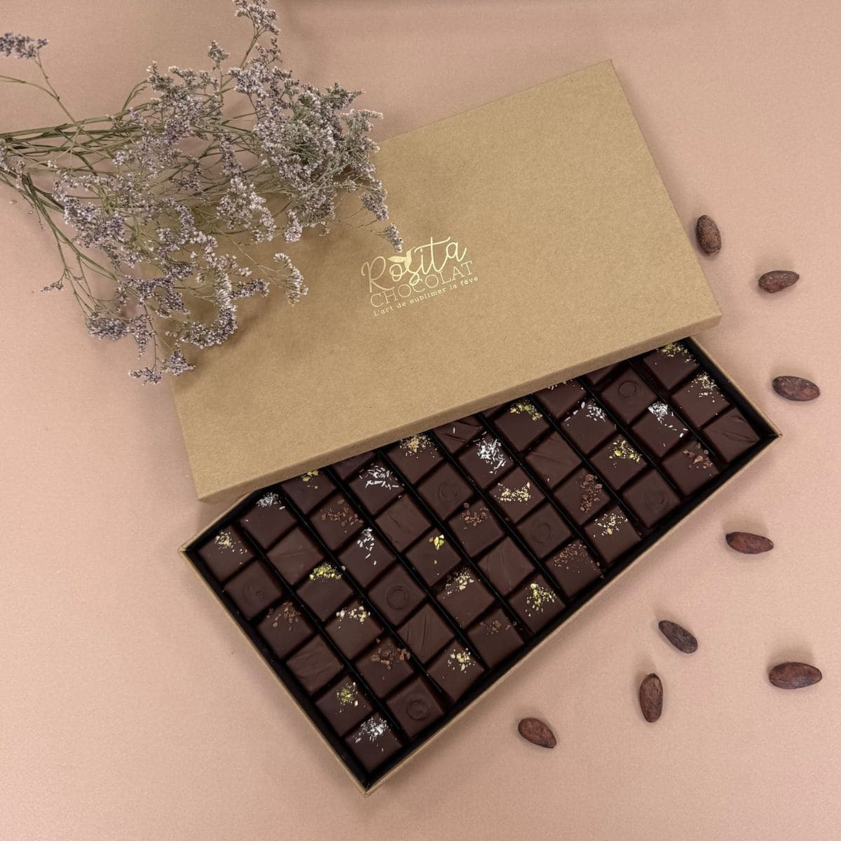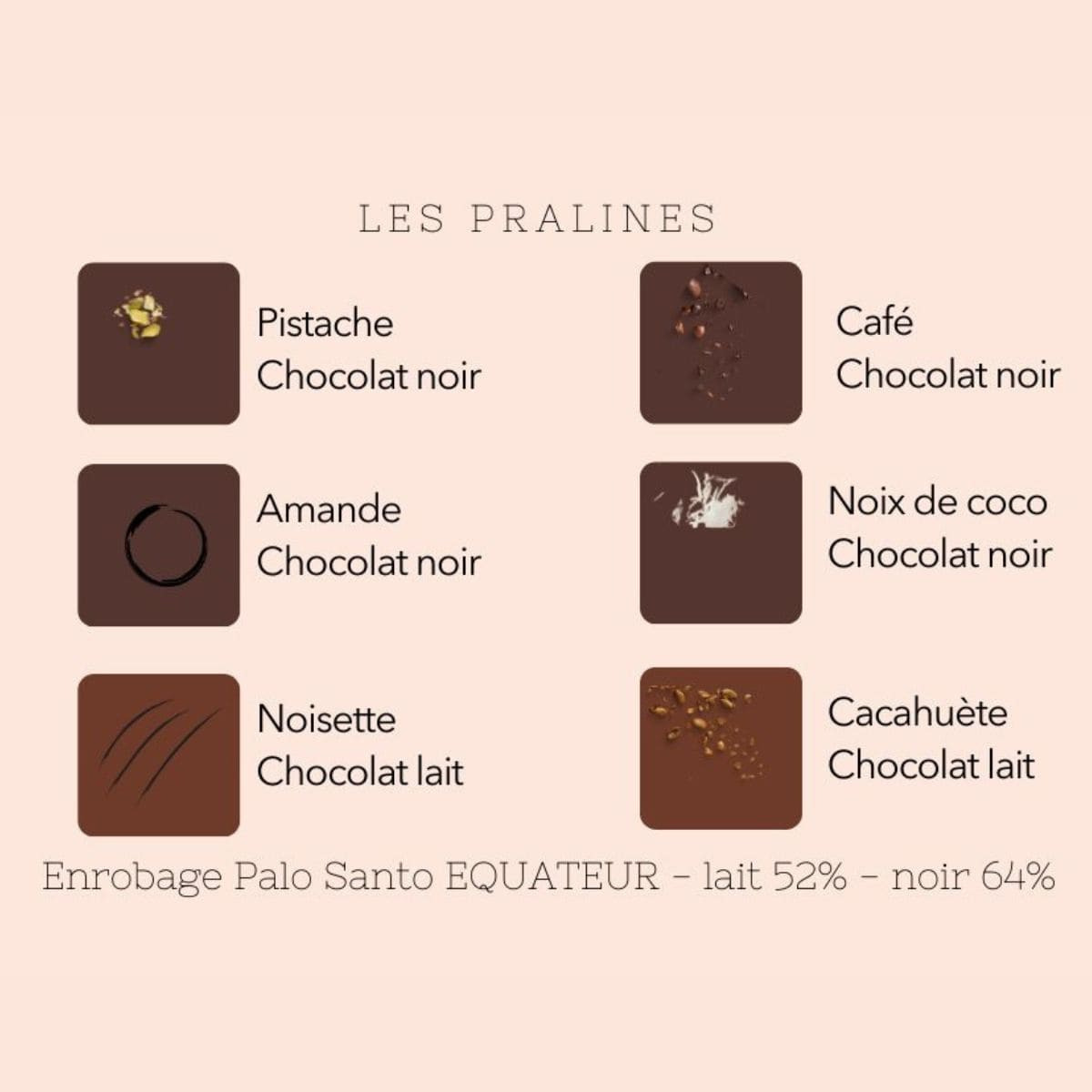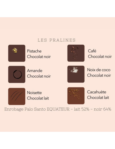 60 bonbons pralinés avec un enrobage chocolat Palo Santo Équateur et un praliné légèrement croustillant en bouche.