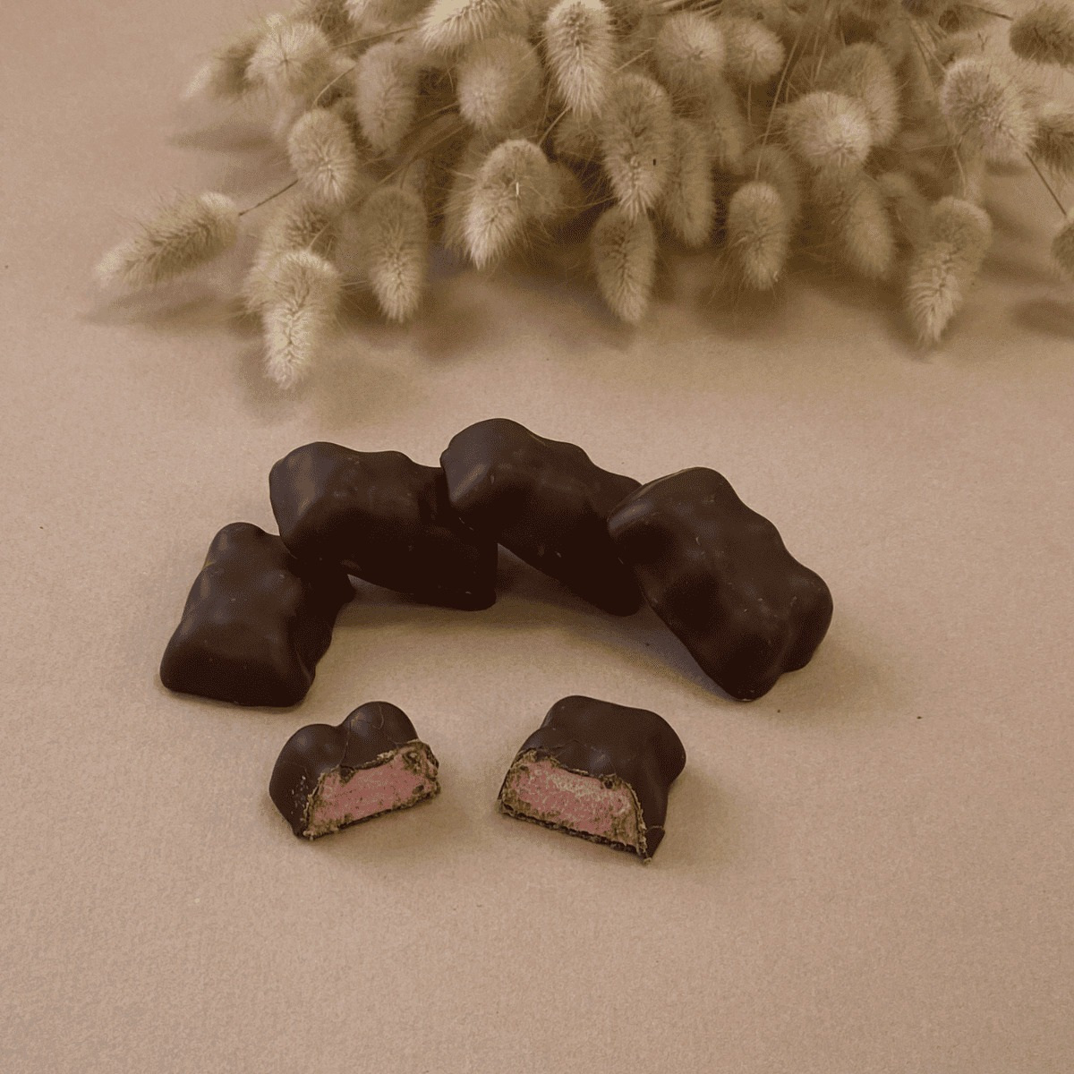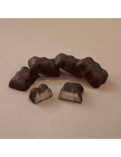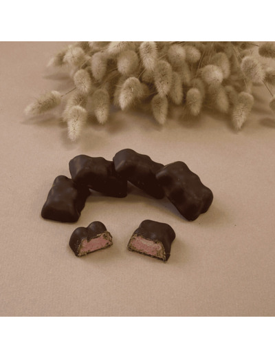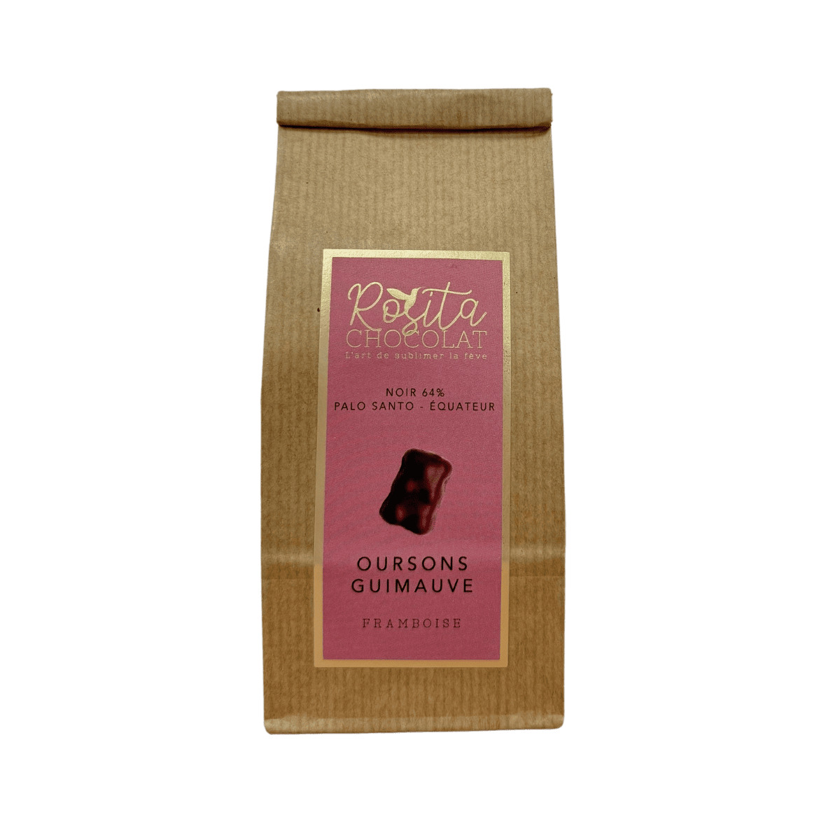 Des oursons avec un enrobage chocolat noir Palo Santo Equateur et une guimauve framboise explosive en bouche.