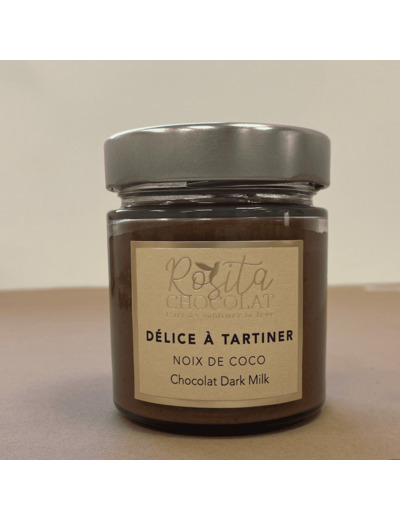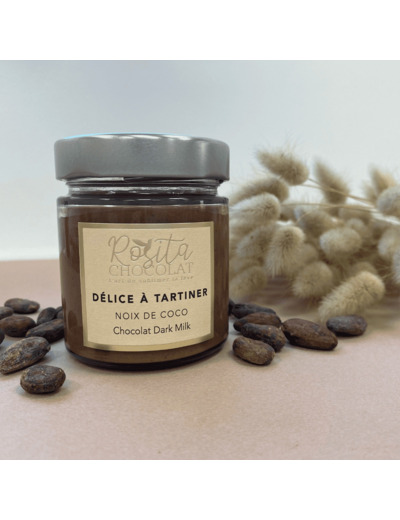 Délice à tartiner noix de coco, fabriqué dans notre manufacture avec 39% de noix de coco, un peu d'amandes et notre chocolat Kokoa Kamili de Tanzanie. Un délice surprenant à conserver à température ambiante (sans ajout d’huile, la pâte est plus épaisse que d’habitude).