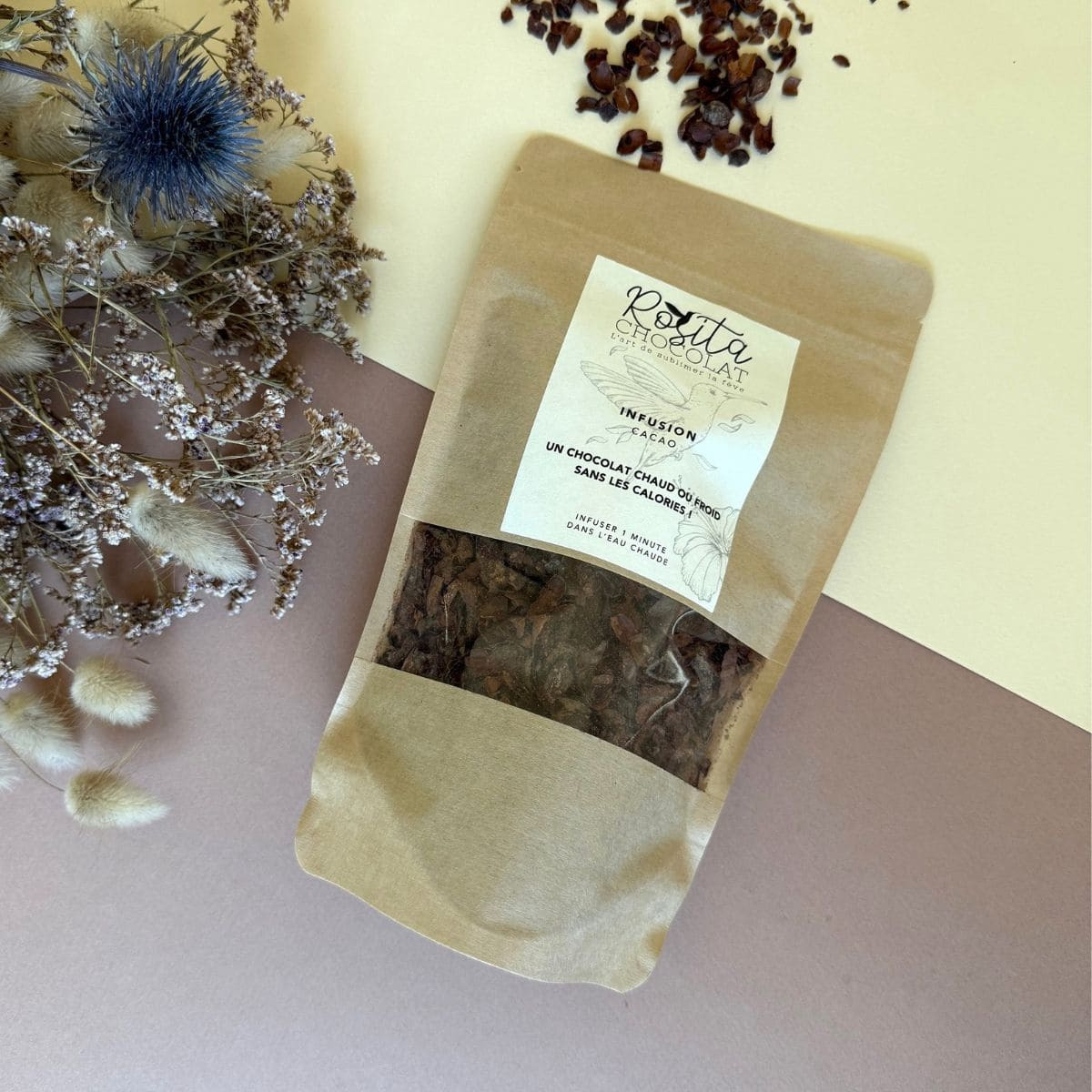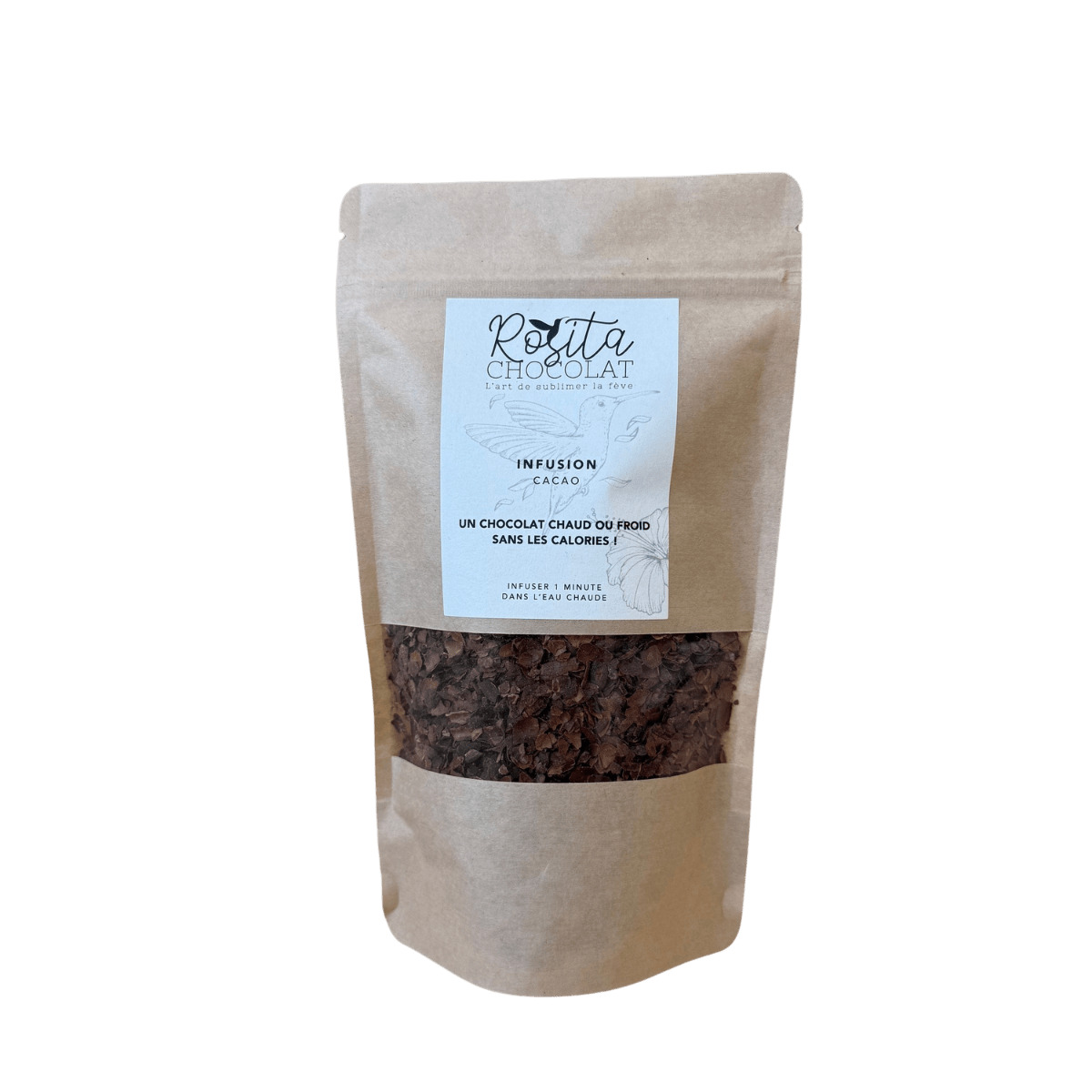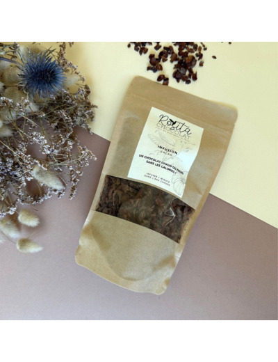 Une infusion avec des cosses de fève de cacao pour retrouver le goût d'un chocolat chaud sans lait ! Une boisson légère à boire chaude ou froide.