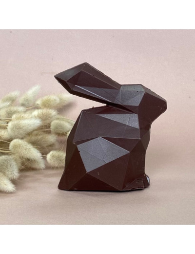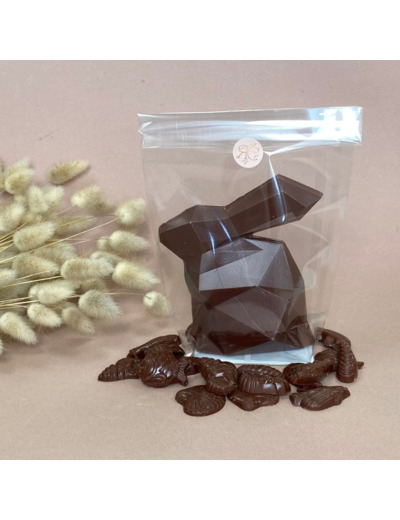 Notre lapin de Pâques au chocolat lait Palo Santo, Équateur, garni de friture chocolat lait Palo Santo. Il mesure 12,5 cm de hauteur par 11,5 cm de largeur.