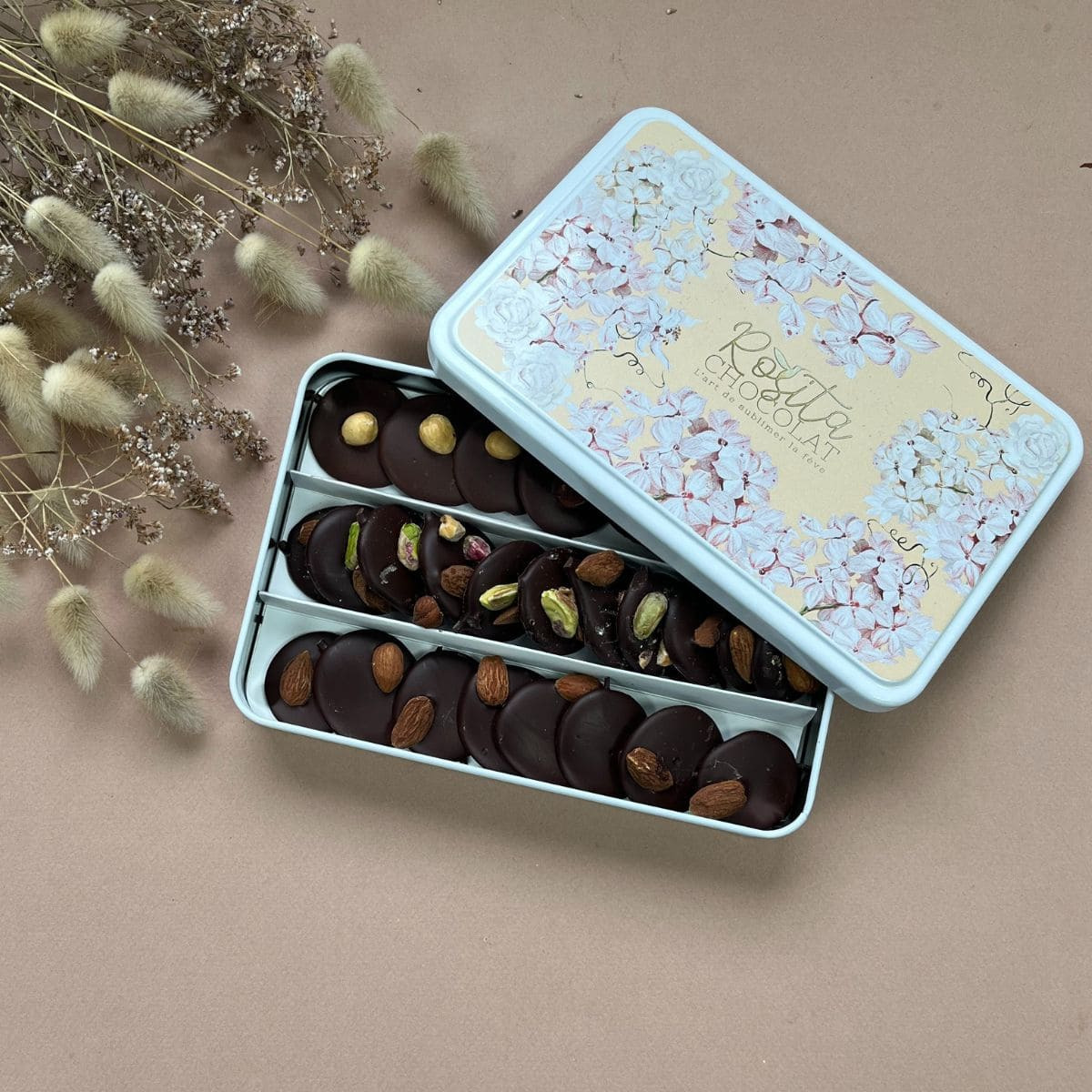 Une jolie boîte métal garnie d'un assortiment de mendiants, de palets lait & noisette et palets noir & amande. Le chocolat lait est travaillé comme tous nos chocolats depuis la fève de cacao. Les fèves sont triées, lentement torréfiées puis broyées pendant 2 à 3 jours jusqu’à devenir un chocolat unique. Notre méthode Bean to Bar, artisanale permet de faire ressortir toutes les notes aromatiques du chocolat.