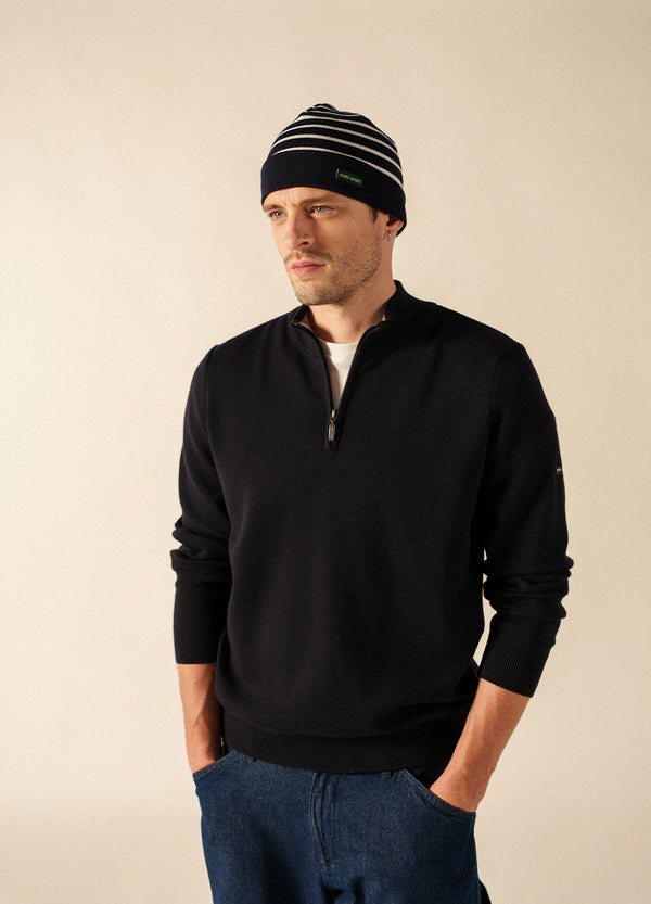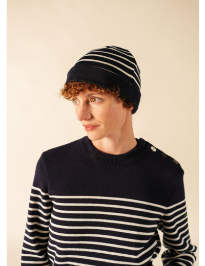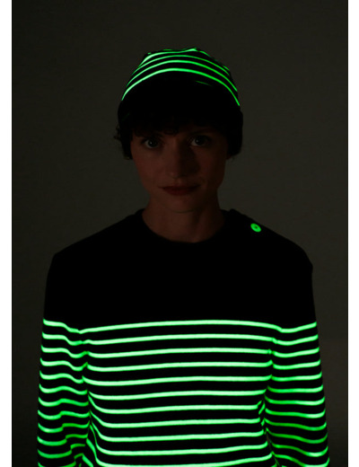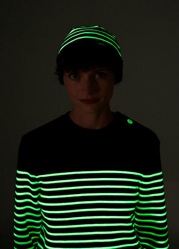 Accessoire intemporel du vestiaire marin, le bonnet est la touche finale qui vous accompagne du matin au soir. Ce modèle, cependant, révèle une surprise une fois la journée terminée : plongé dans l'obscurité totale, son fil phosphorescent, après avoir été exposé à la lumière naturelle ou artificielle pendant près de trois heures, se met à émettre une lumière phosphorescente pendant près d'une à deux heures. Tricoté en France dans nos ateliers, ce modèle rayé avec revers est confectionné en côte 1x1 et rejoint la collection phosphorescente, vous permettant de l'assortir à la marinière Minquiers, au pull Binic et même au pull de votre chien.