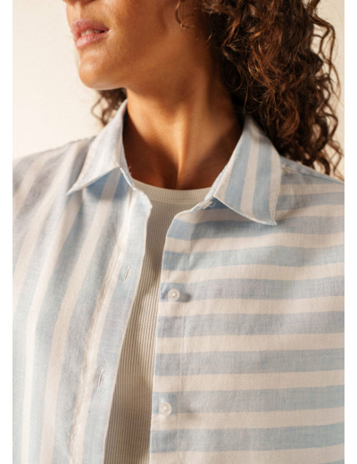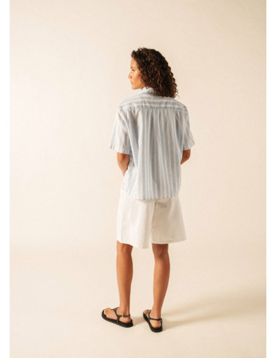 Pour une journée en ville où le soleil se reflète sur les façades, la chemise Alma apporte une touche d'originalité à une silhouette estivale. Son jeu de rayures, volontairement asymétrique et placé uniquement sur le devant, lui confère un caractère singulier. Sa confection en coton et lin mise sur des fibres naturelles qui respirent, tandis que sa coupe droite et ses manches courtes sont pensées pour offrir de l'aisance lors des journées chaudes.