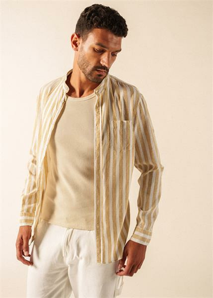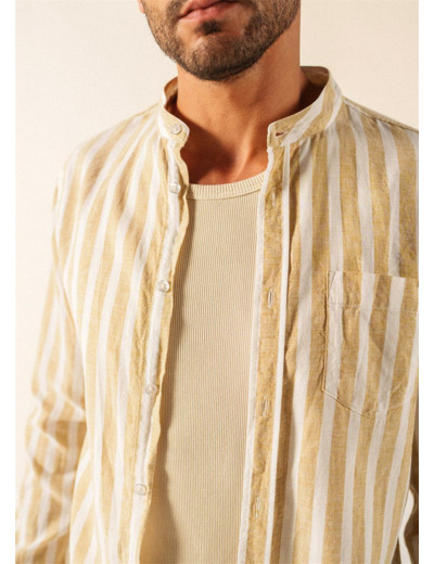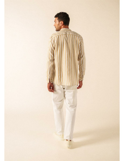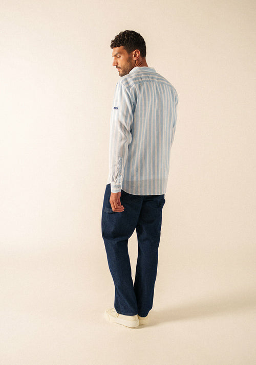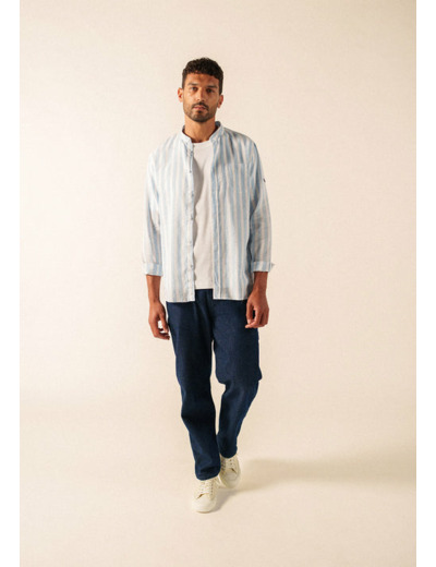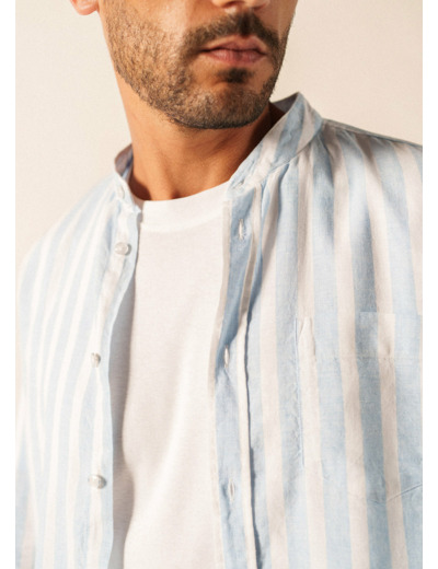 Les rayures sur une toile légère sont une invitation directe aux journées ensoleillées, et la chemise Liam s'inscrit parfaitement dans cet esprit. Sa matière, un mélange de coton et de lin, procure une bonne sensation de fraîcheur pour l'été. Le col officier lui donne une allure plus épurée qu'un col classique, et la poche poitrine vient simplement habiller le devant. Sa coupe droite dessine une silhouette nette tout en vous laissant une bonne aisance, et ses manches longues se retroussent facilement lorsque la température monte.
