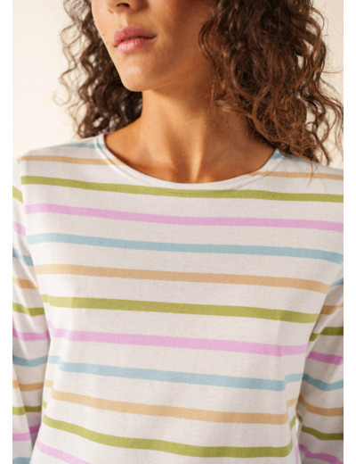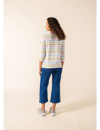 Les rayures signatures, appréciées pour leur aspect graphique ou coloré, revendiquent leur identité marine et la liberté d’esprit qu’on lui associe. De la mer à la ville, la marinière Galathée se transpose aux différents styles avec spontanéité et envie. Ses manches ¾ , son encolure ronde et sa coupe près du corps féminisent la pièce iconique.