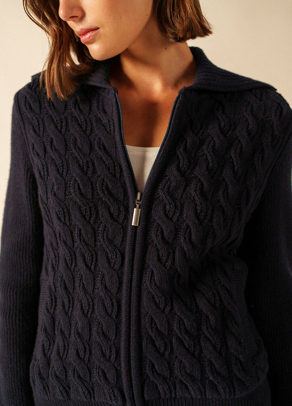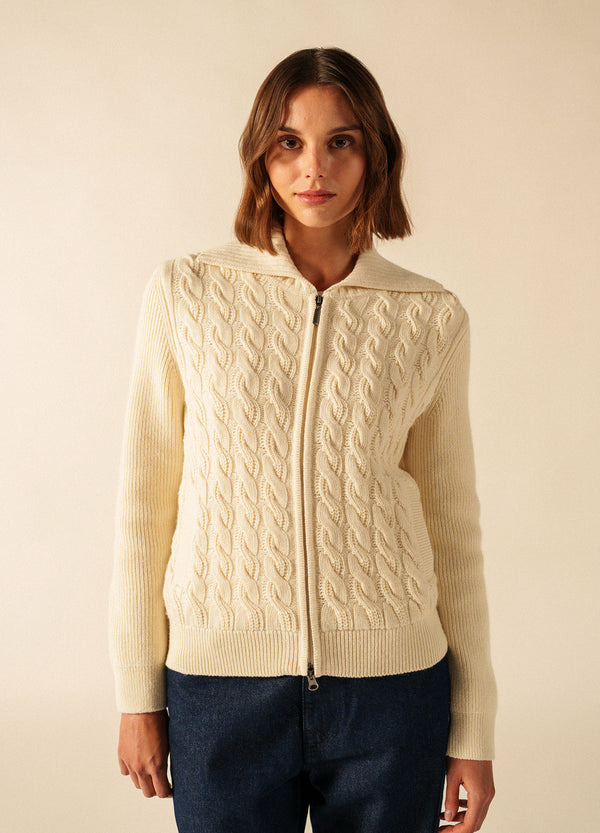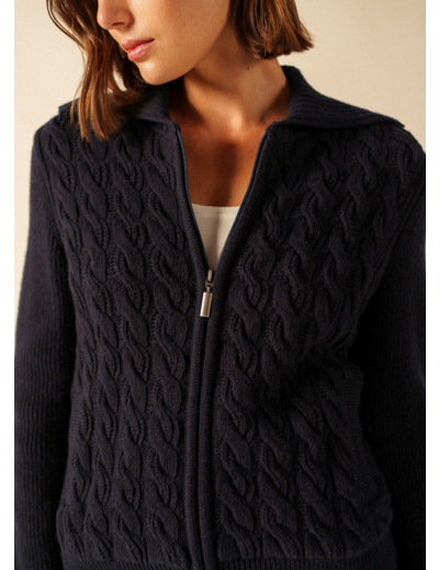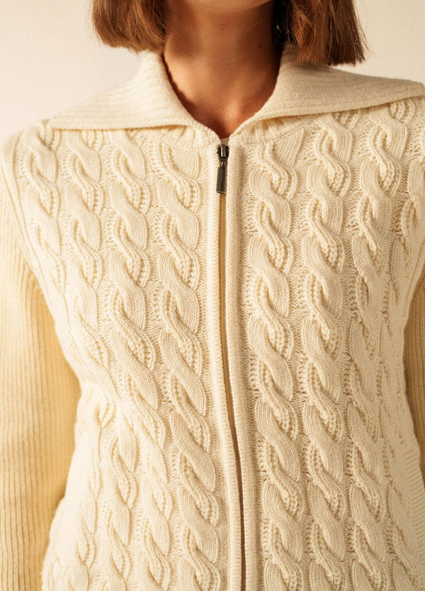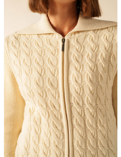 Composé d'un mélange de laine et de coton, ce gilet présente un motif torsadé sophistiqué. Le bas du corps en bord-côte assure un ajustement confortable. Il possède deux poches extérieures pour ranger vos petits effets personnels. Conçu pour vous tenir chaud, il s'adapte parfaitement aux journées fraîches. Sa fermeture éclair pratique complète son design fonctionnel et moderne. - Veste zippée