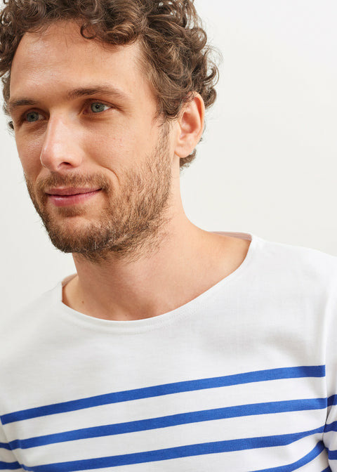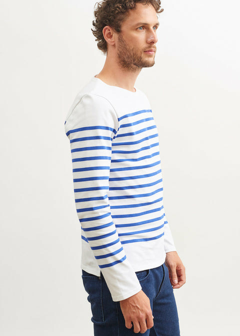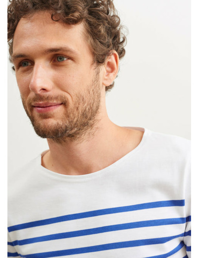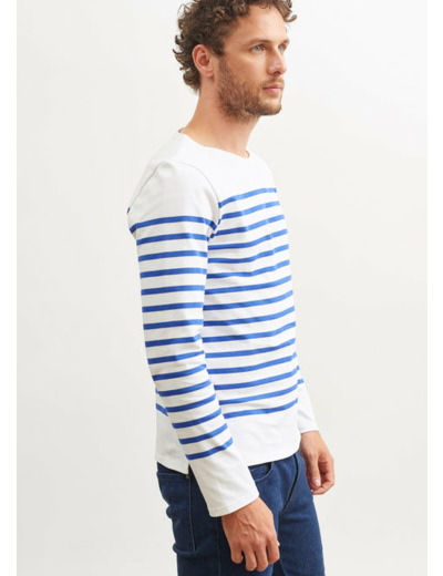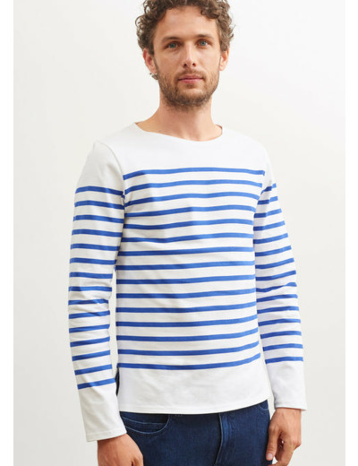 Marinière authentique, le modèle Naval est confectionné en coton peigné, un coton doux et léger. Son empiècement uni en haut et bas de corps ainsi que ses fentes sur les côtés lui apportent une touche de légèreté, pour adopter le style marin avec facilité.
