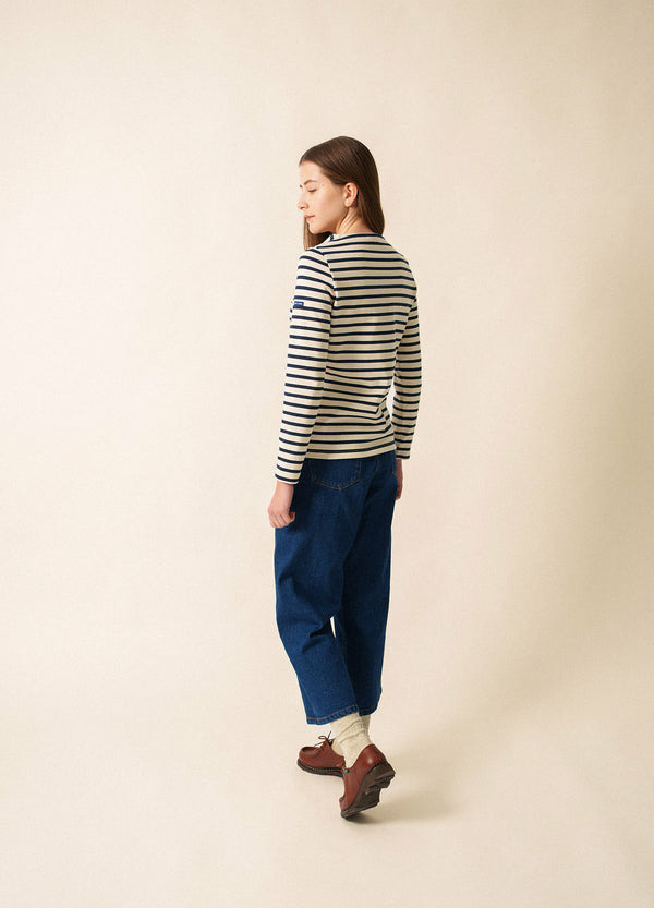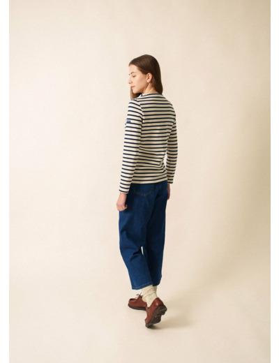 La marinière classique Méridame, agrémentée d'un délicat cœur sur la poitrine. Réalisée en jersey lourd, cette pièce fait partie de la capsule Amour. Confectionnée dans nos ateliers à Saint-James, symbole du savoir-faire textile français.