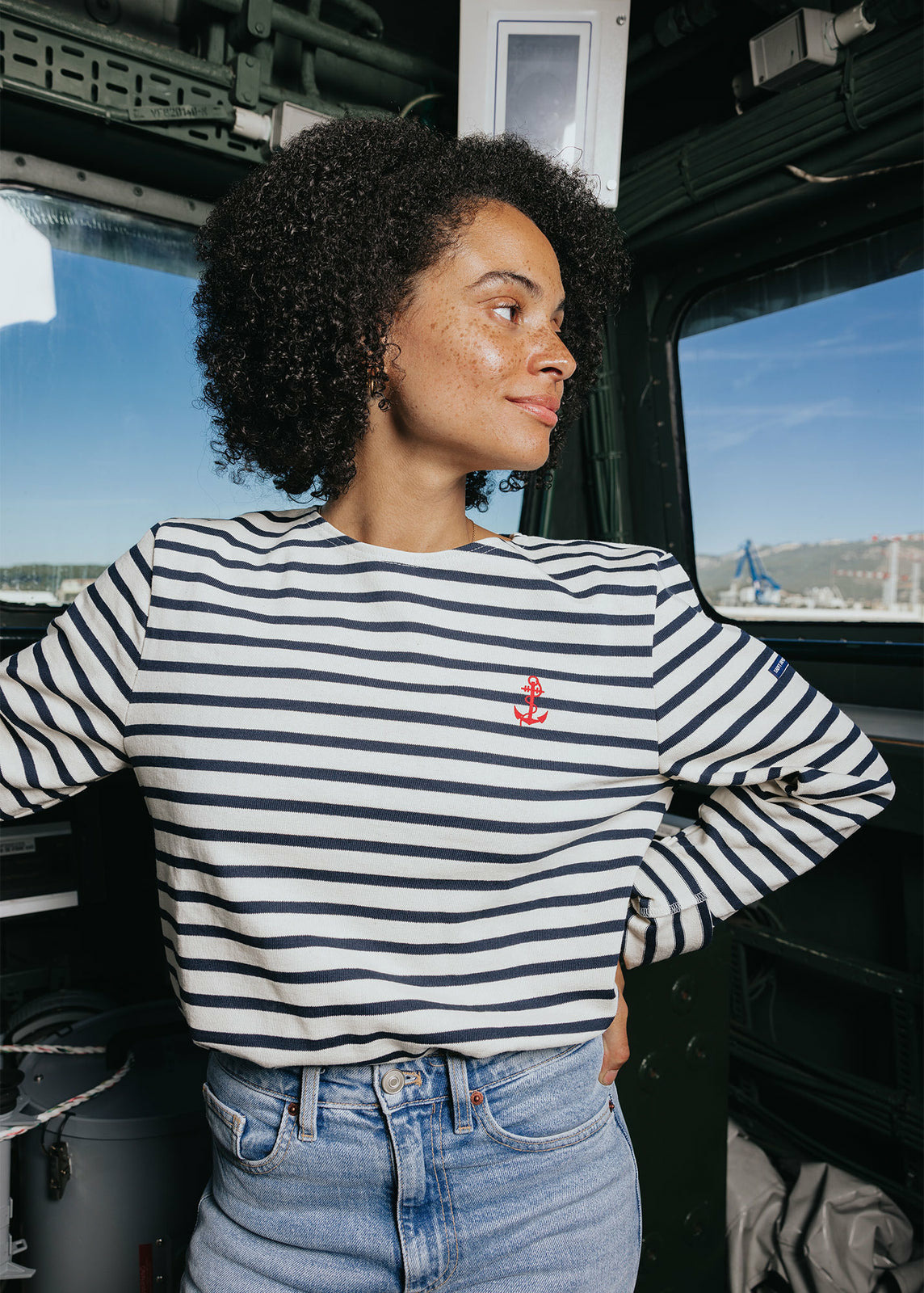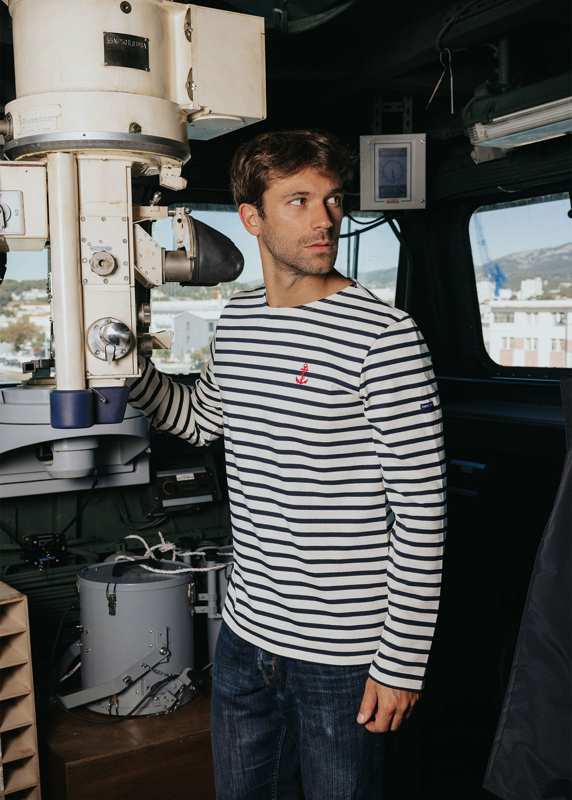 Une balade sur le port qui s'anime au retour des bateaux, un moment où l'on apprécie les classiques qui ont une histoire. La marinière Frégate reprend les fondamentaux de notre pièce iconique : le jersey rayé 100% coton, la coupe droite et l'encolure bateau. La collaboration avec la Marine Nationale s'exprime à travers deux détails au toucher velours rouge, un motif d'ancre sur la poitrine et les initiales « MN » au dos, qui signent cette rencontre. Entièrement fabriquée dans nos ateliers en France, elle témoigne d'un savoir-faire et d'un héritage partagés.