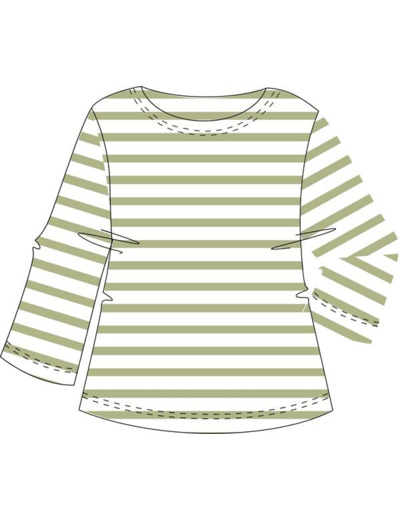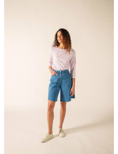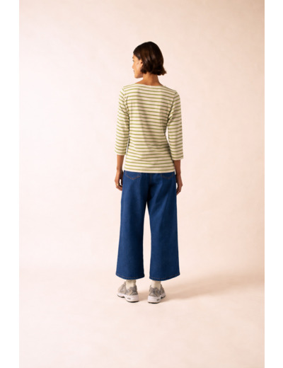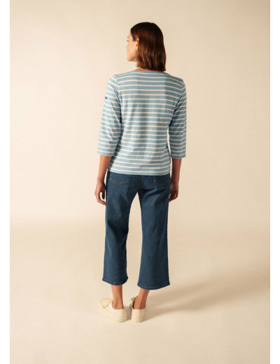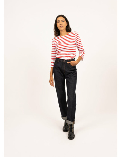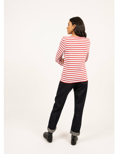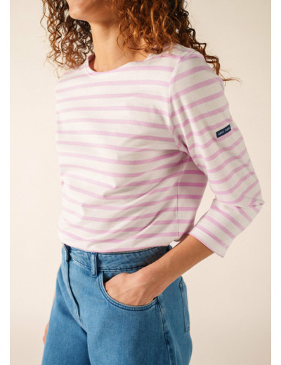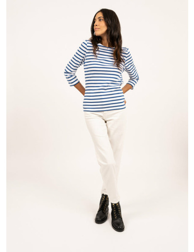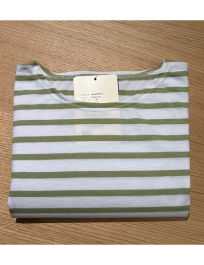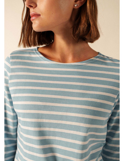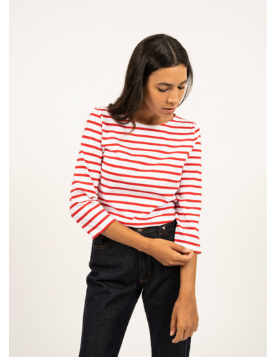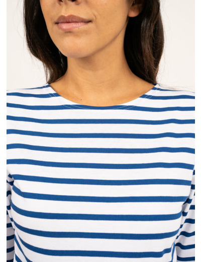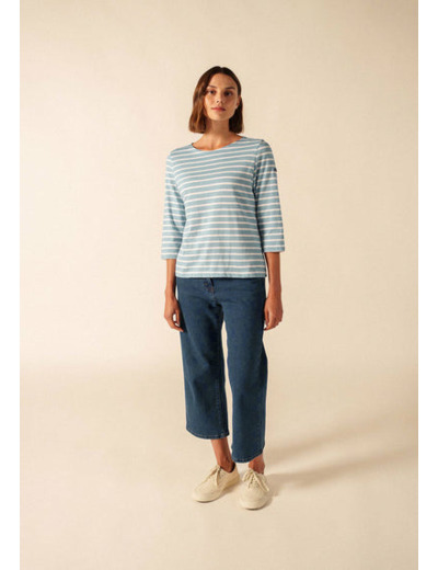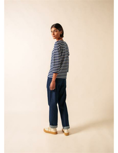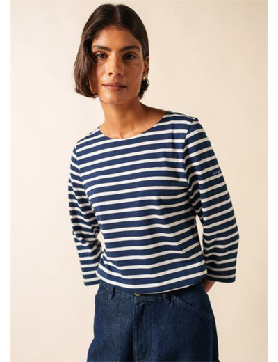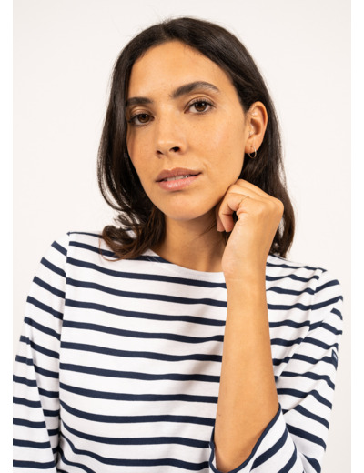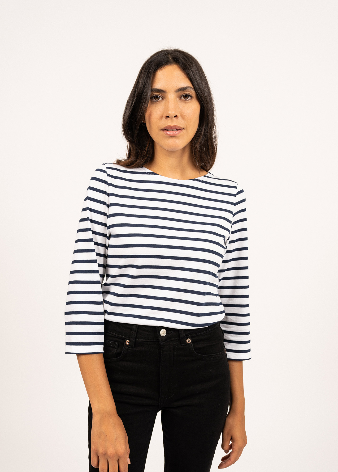 Les rayures signatures, appréciées pour leur aspect graphique ou coloré, revendiquent leur identité marine et la liberté d’esprit qu’on lui associe. De la mer à la ville, la marinière Galathée se transpose aux différents styles avec spontanéité et envie. Ses manches ¾ , son encolure ronde et sa coupe près du corps féminisent la pièce iconique.