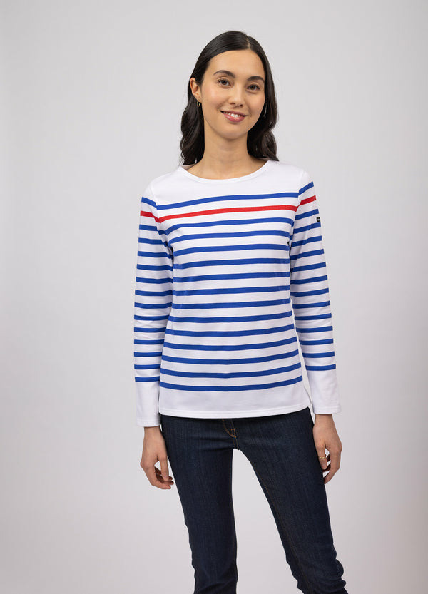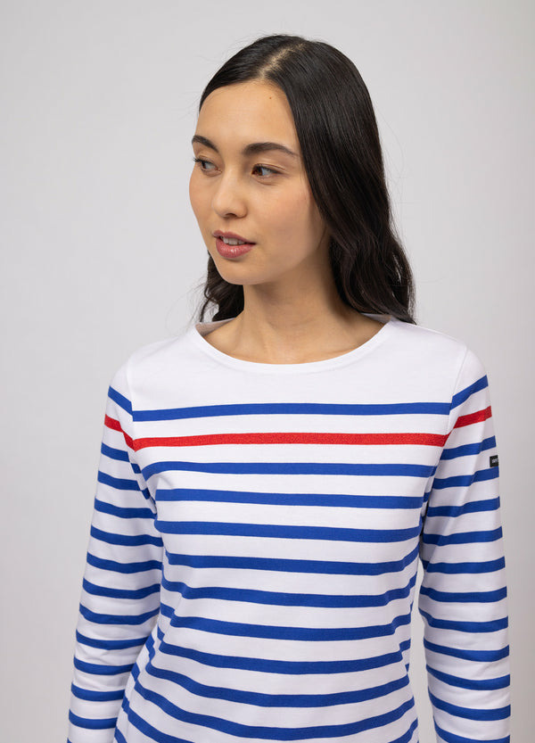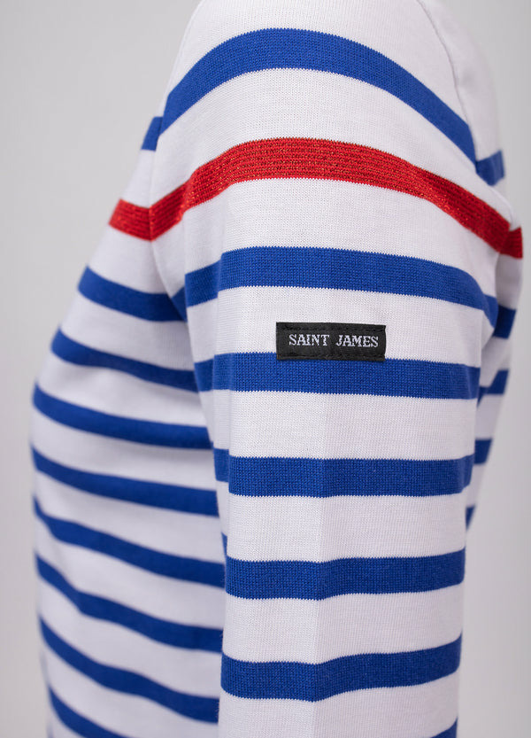 Version féminine de la marinière authentique Naval, ce modèle est lui aussi fabriqué en coton peigné, un coton doux et confortable. Blanche rayée de notre iconique bleu gitane, elle reprend les codes de la traditionnelle marinière présente dans l'uniforme des marins, féminisés par la rayure rouge lurex contrastée.