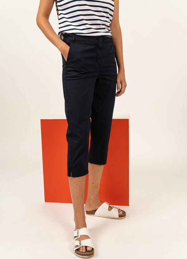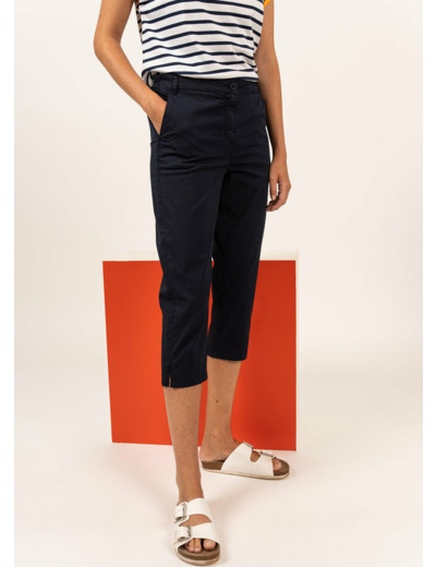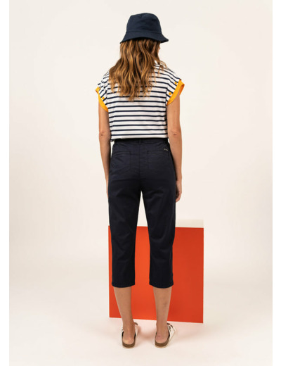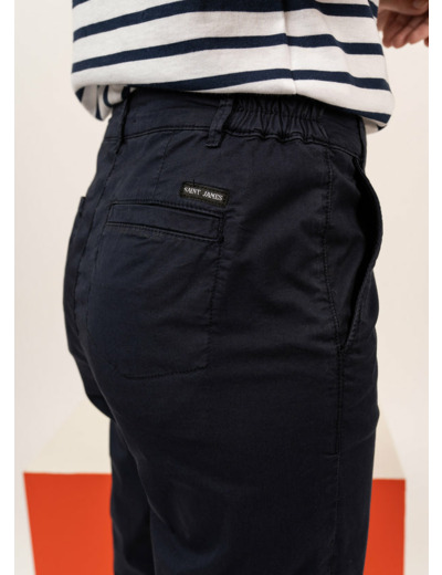 Poches plaquées à l'arrière, taille élastiquée, passants à la taille, braguette zippée.