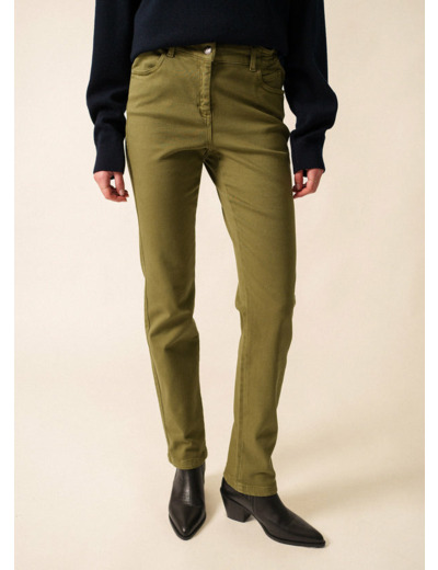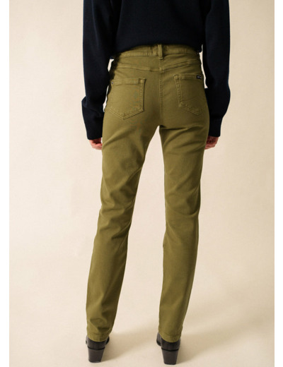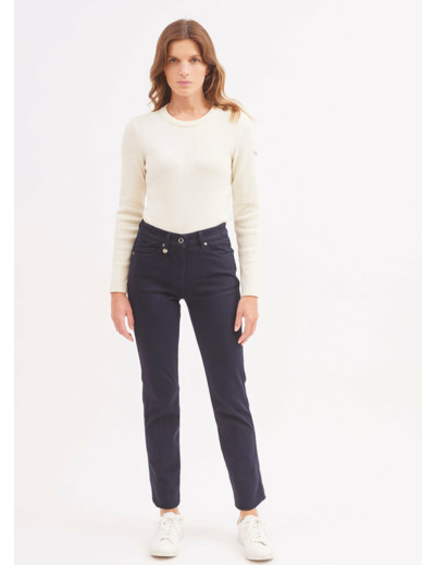 Le pantalon Patricia présente un atout majeur : le confort. Outre la ceinture élastiquée sur les côtés, il est confectionné dans une matière qui s’approche du jean dans sa robustesse alors qu’elle est tricotée. Visuellement, on ne le devine pas mais la maille permet à la matière de s’étirer dans la hauteur comme dans la largeur, et grâce à sa part d’élasthanne, épouser au mieux les courbes du corps.