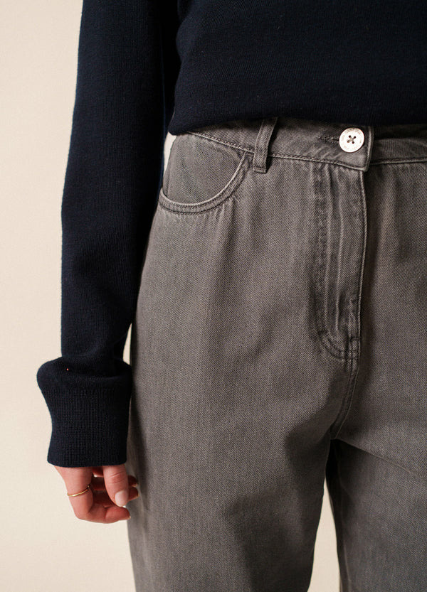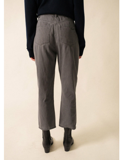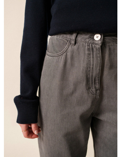 Le pantalon Zélie est conçu dans un esprit "mom fit", offrant une coupe confortable et moderne. Réalisé en denim twill 100% coton, il garantit une durabilité et un bon confort. Les boutons gravés argentés ajoutent une finition soignée à ce modèle. Ce pantalon se prête à une variété de styles, facile à associer.