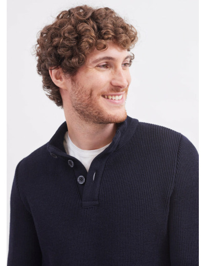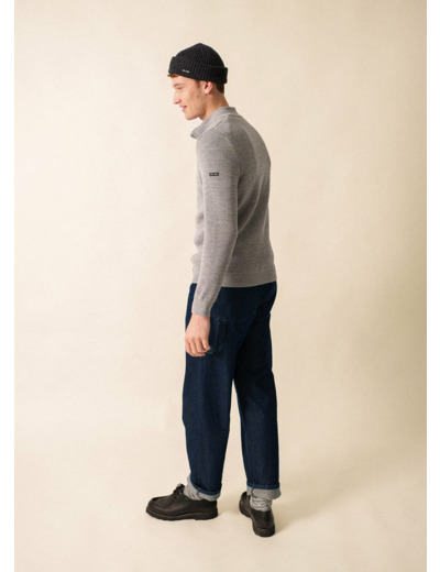 Exemple du savoir-faire Saint James, le pull Bourboule reprend le tricot serré emblématique, agrémenté d’un jeu de côtes anglaises chevalées sur le col, plus fantaisiste, qui crée un motif chevron raffiné.