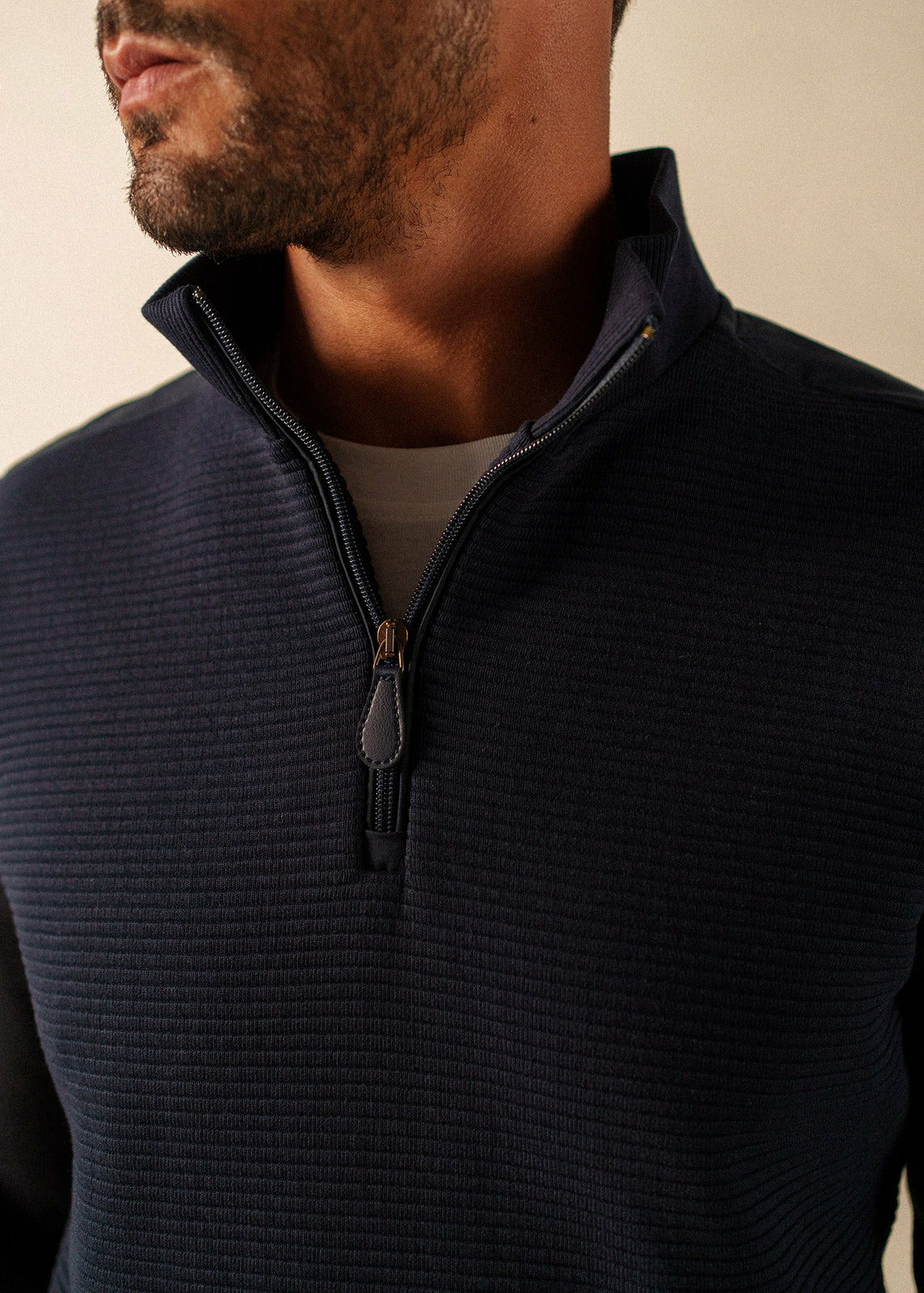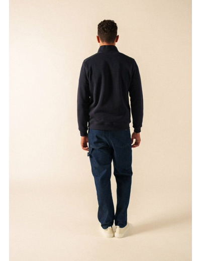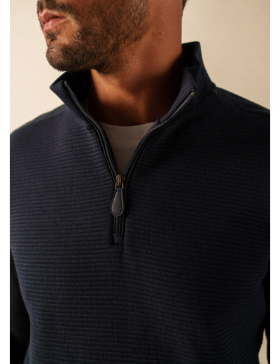 Quand le vent se lève en fin de journée et que l'air se rafraîchit, on apprécie d'avoir une pièce qui offre un peu de protection sans être trop lourde, et c'est exactement le rôle du pull Malo. Son col montant se remonte entièrement grâce à son zip pour bien couvrir le cou. Juste en dessous, à l'intérieur, se trouve une petite pièce en motif oxford rehaussée de surpiqûres jaunes : un détail de caractère, une sorte de signature discrète visible uniquement pour vous. Tricoté en côte américaine, une maille légèrement épaisse, il se distingue aussi par un jeu de textures sur les épaules ce qui enrichit son apparence. Sa coupe droite lui donne une ligne simple, tandis que les finitions en bord-côtes aux poignets et à la base permettent au vêtement de bien conserver sa forme.