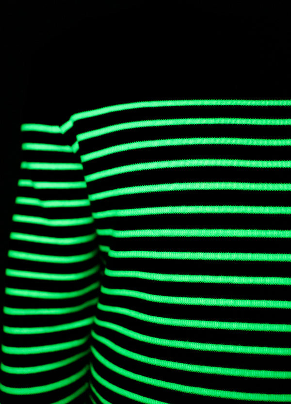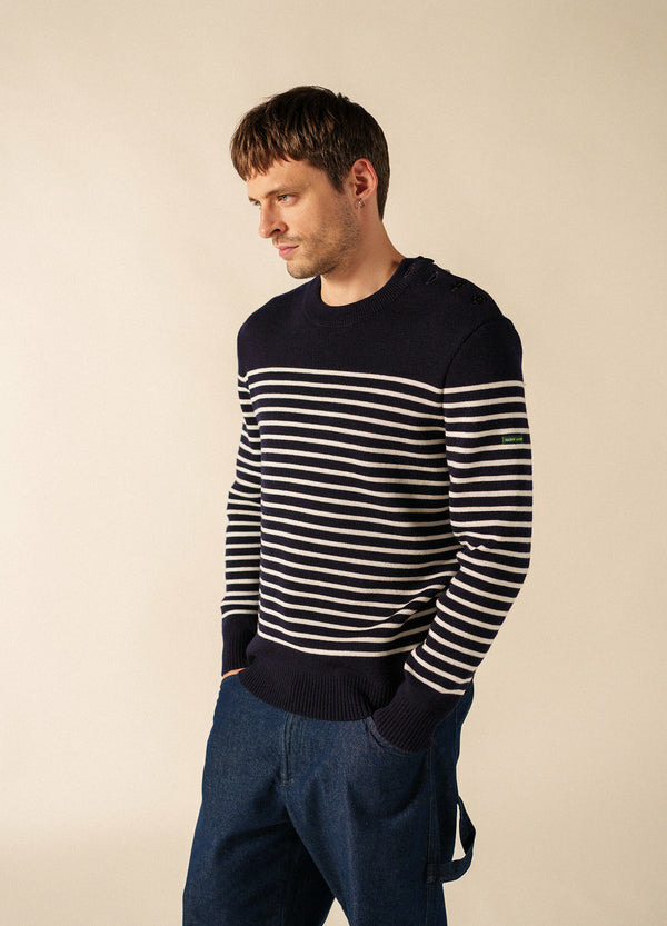 Le pull marin est une pièce qui traverse les journées et les saisons sans jamais perdre de sa superbe. Celui-ci conserve l'héritage authentique du modèle Binic avec son tricot en côte 1x1, son col rond et sa coupe droite, le tout confectionné dans nos ateliers français. Il garde cependant un secret pour la fin de journée : une fois plongé dans l'obscurité, ses rayures, après avoir été exposées à la lumière naturelle ou artificielle pendant près de trois heures, se mettent à luire pendant près d'une à deux heures. Ce n'est pas un phare dans la nuit, mais plutôt une touche de fantaisie sur un vêtement iconique. Il s'inscrit dans la collection phosphorescente, vous permettant d'assortir cette pièce avec la marinière Minquiers, le bonnet, et même le pull de votre chien.