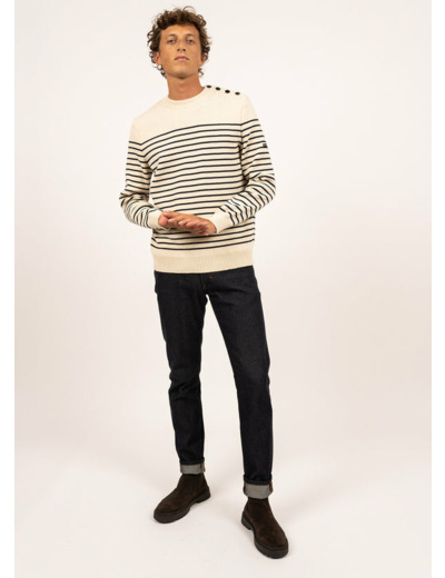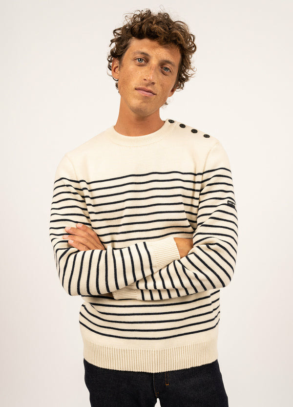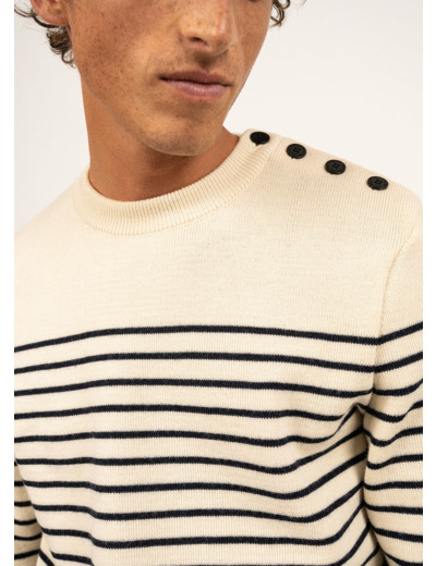 Issu de la tradition marine, le pull Binic reprend l’association des rayures et de l’empiècement uni, caractéristique des marinières.