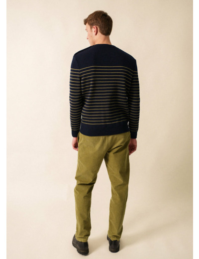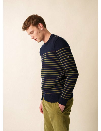 Issu de la tradition marine, le pull Binic reprend l’association des rayures et de l’empiècement uni, caractéristique des marinières.