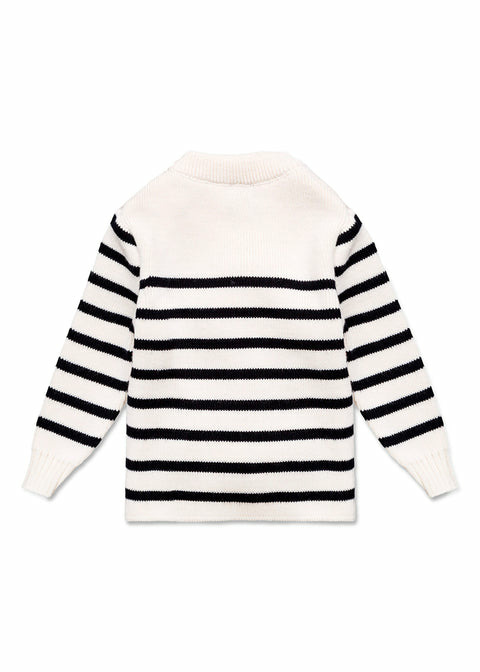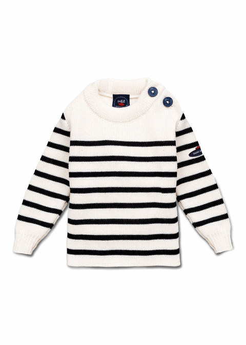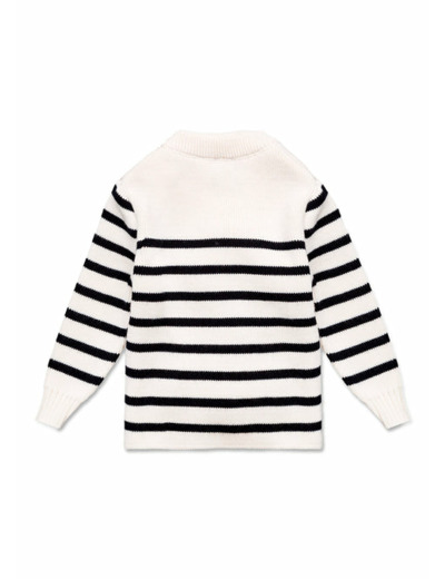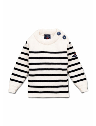 Pull marin rayé avec empiècement uni en haut. Boutonnage épaule. Bord côte bas de manche.