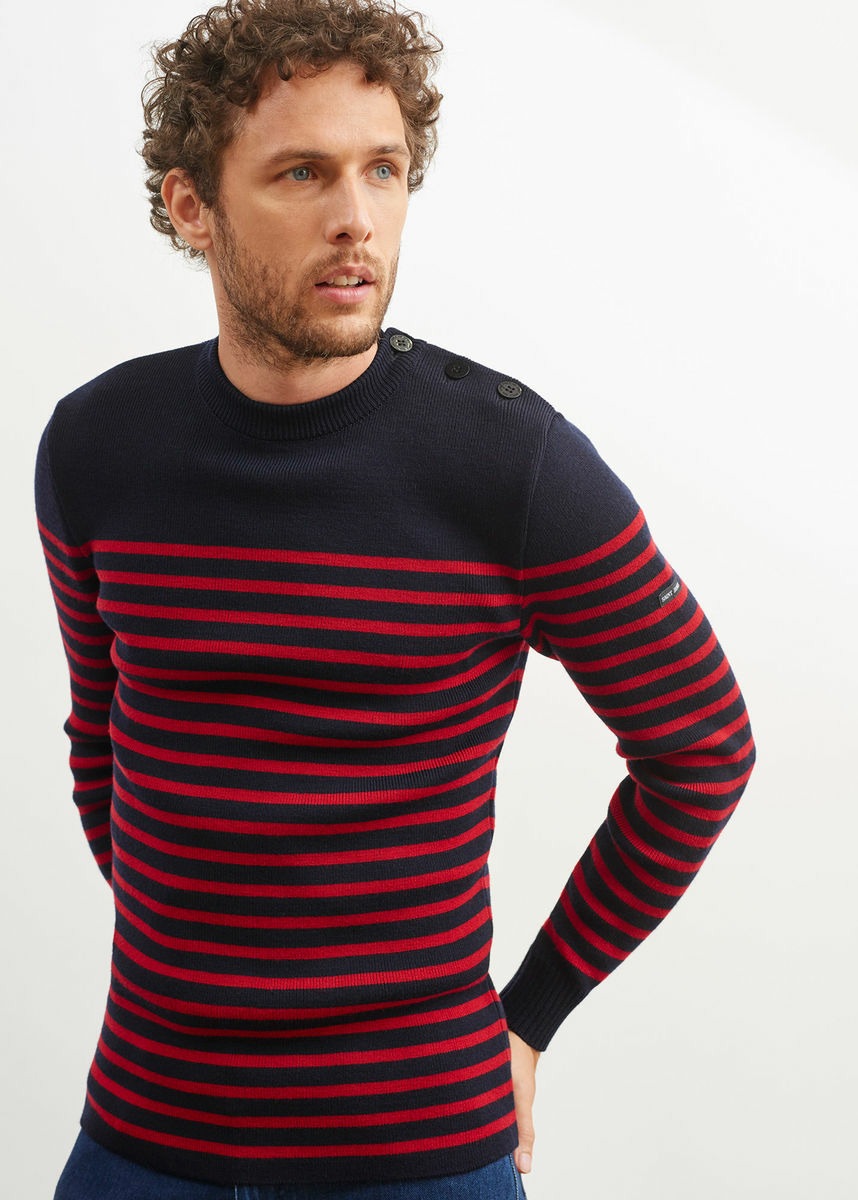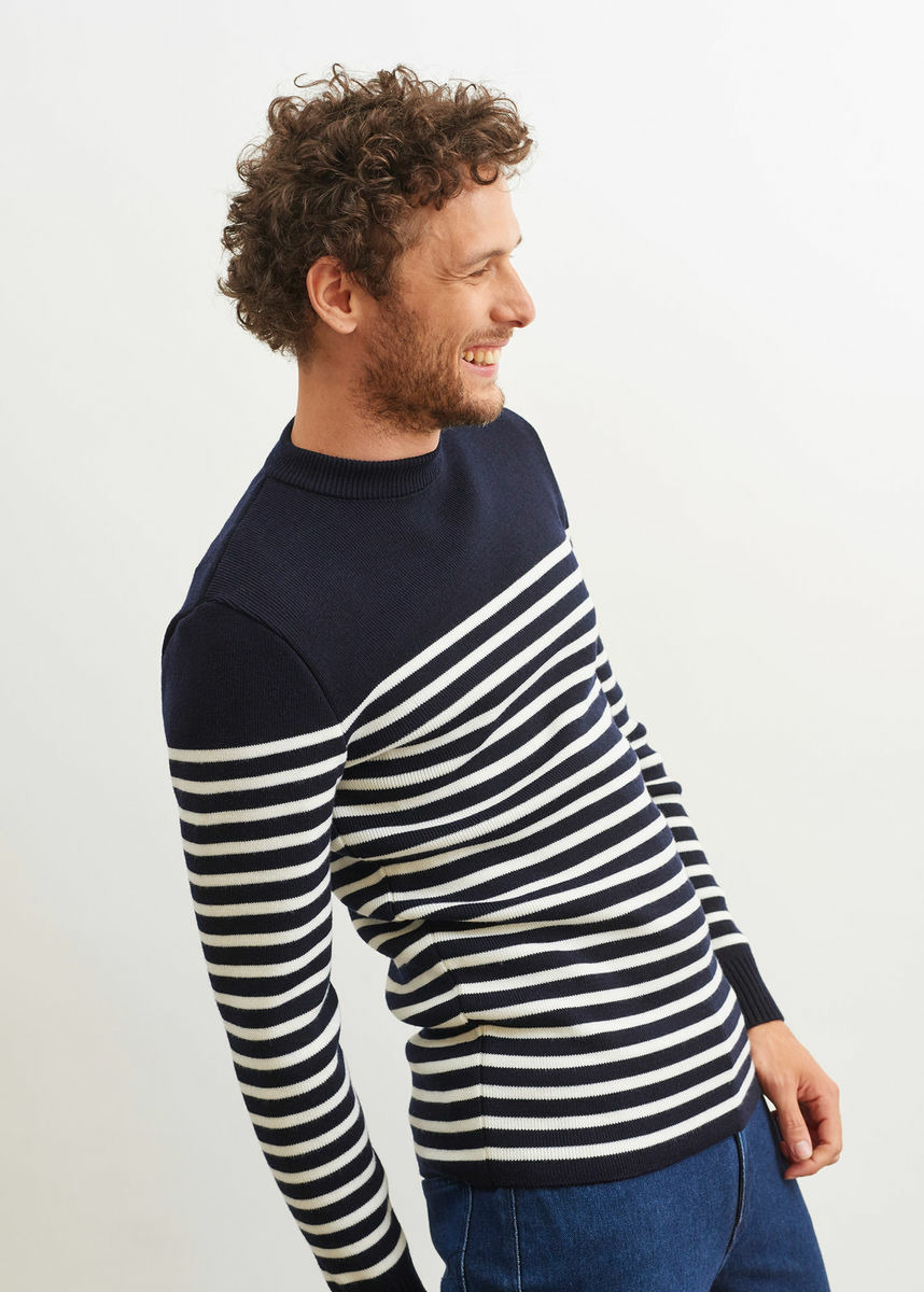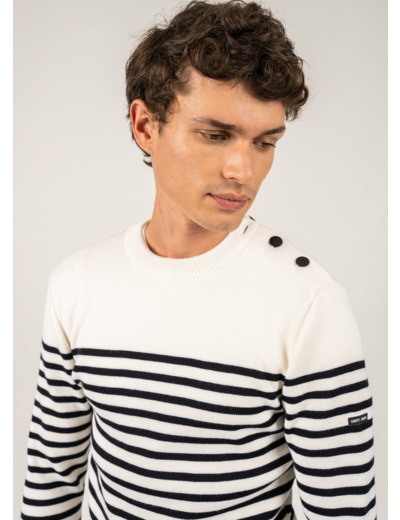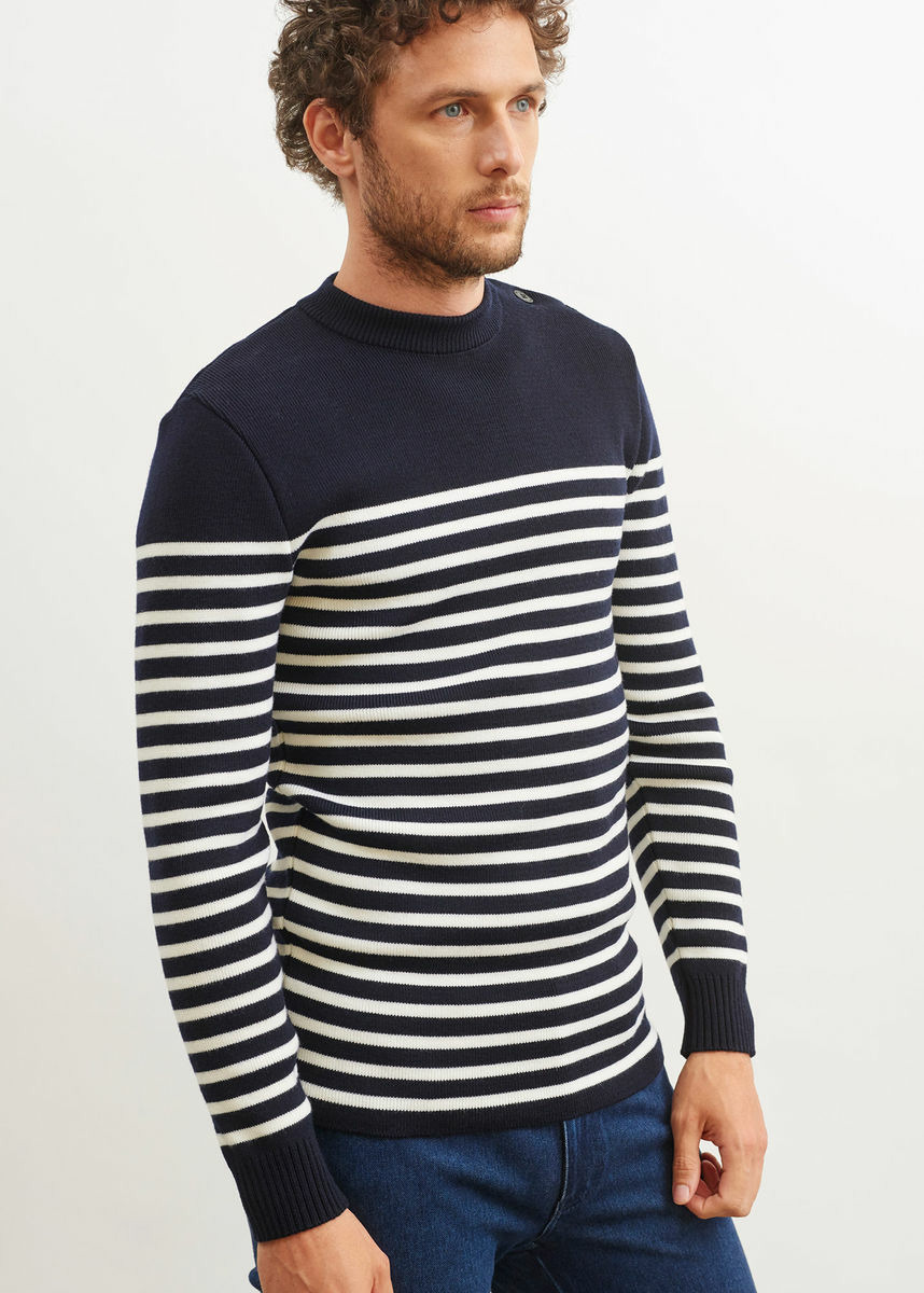 Avec ses rayures et son empiècement uni, le pull Rochefort affirme son identité marine. La coupe ajustée et le boutonnage épaule complètent la liste des éléments distinctifs du pull marin. La matière, elle, rompt avec la tradition : la laine de ce modèle est plus douce que la laine authentique, afin que chacun puisse adopter le look marin.