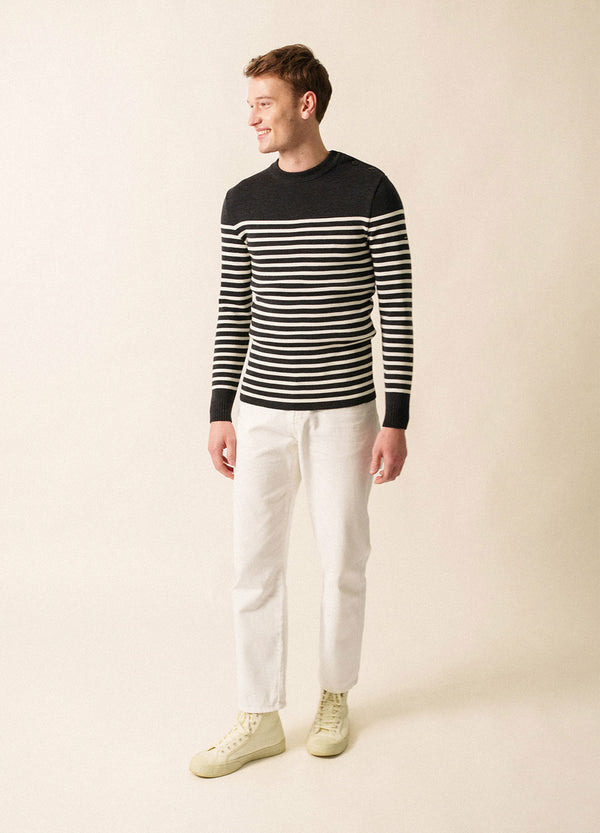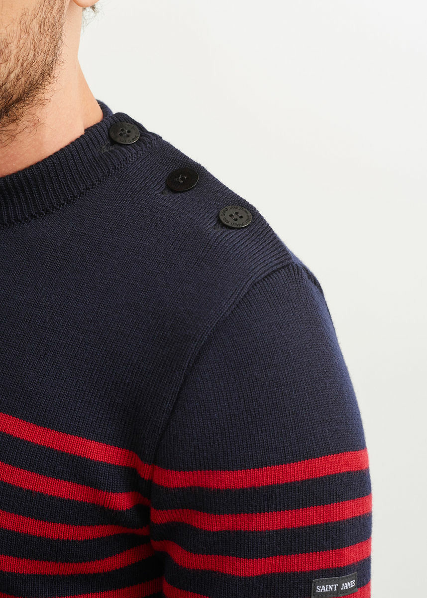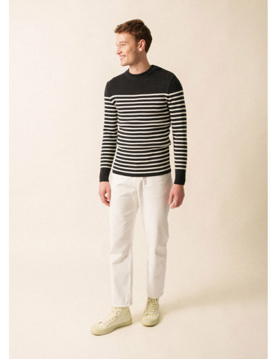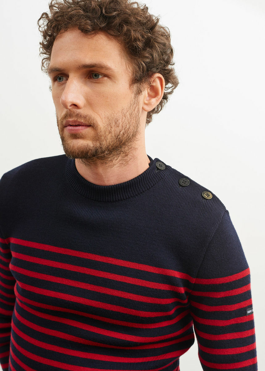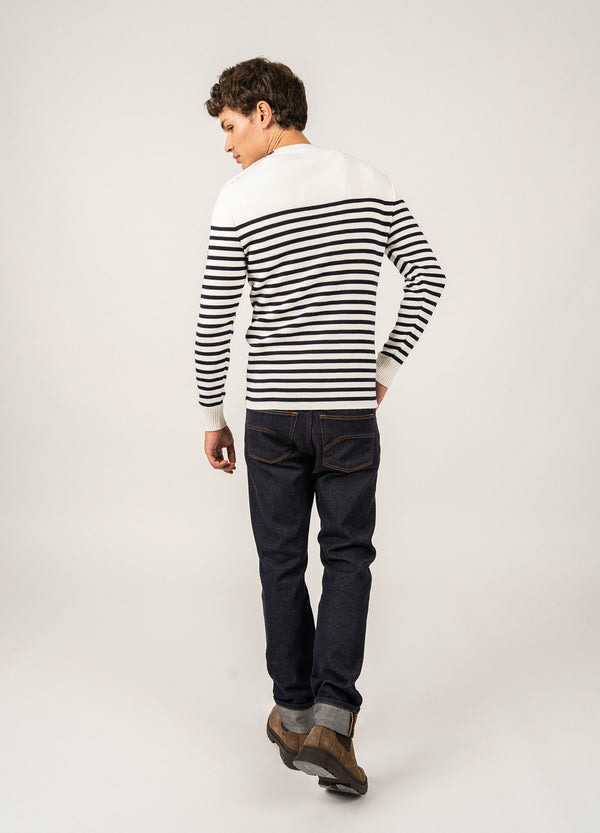 Avec ses rayures et son empiècement uni, le pull Rochefort affirme son identité marine. La coupe ajustée et le boutonnage épaule complètent la liste des éléments distinctifs du pull marin. La matière, elle, rompt avec la tradition : la laine de ce modèle est plus douce que la laine authentique, afin que chacun puisse adopter le look marin.
