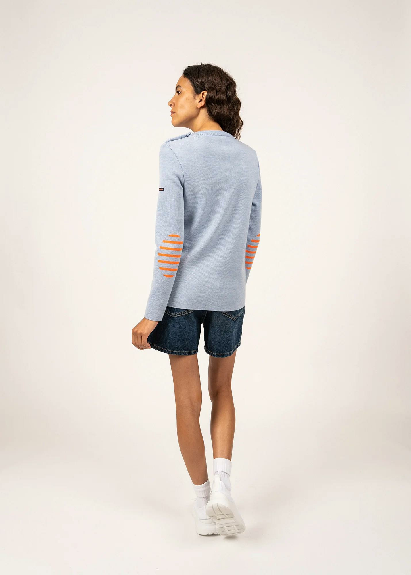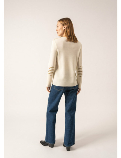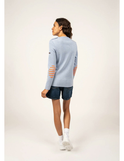 Pull marin uni avec coudières rayées. Détail épaule avec boutonnage fantaisie.