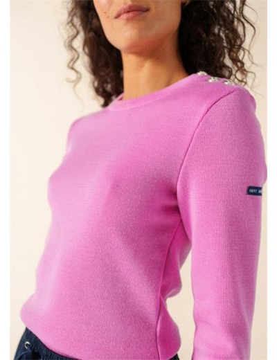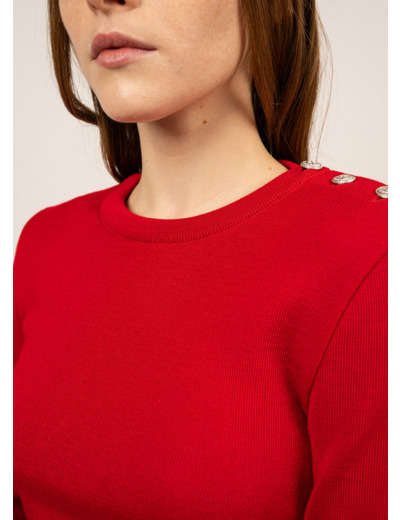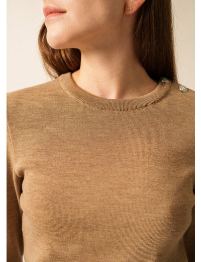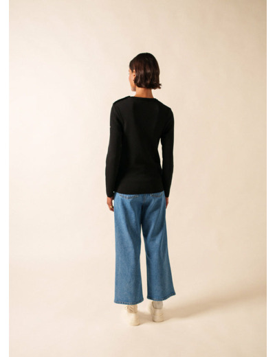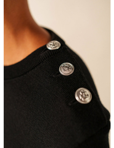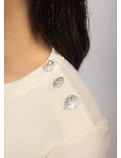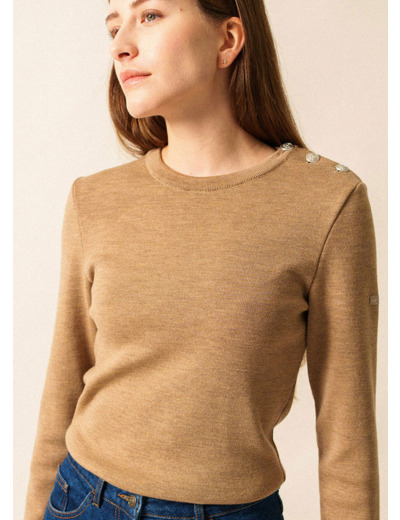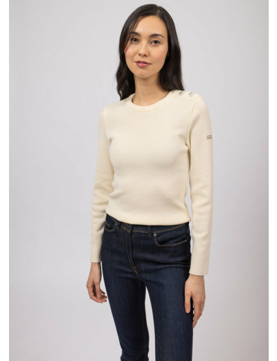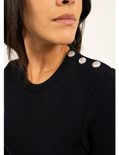 Moins lourd et plus doux que l’authentique pull marin, le pull Marée en conserve les caractéristiques esthétiques : coupe ajustée, col ras du cou et ouverture épaule. Scintillants, les boutons argentés mat sont ornés d’une ancre en relief.