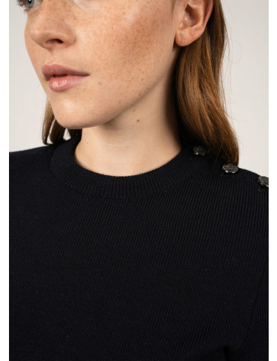 Version féminine de notre intemporel Rochefort, ce pull marin en laine est tricoté dans nos Ateliers, à Saint-James. Pour plus de confort, il reprend le fit de notre pull Brégançon, dans la laine douce du Rochefort. A l'épaule, notre classique boutonnage se pare de boutons en résine imitation corne.