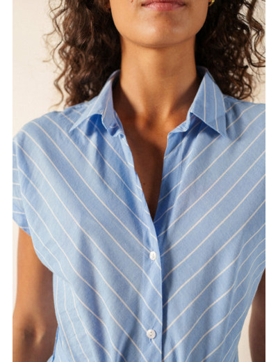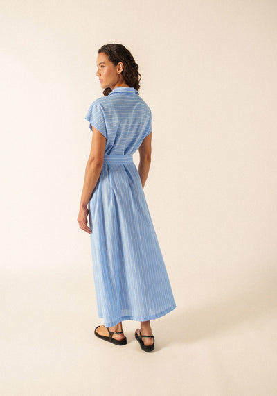 Quand la chaleur de fin de journée s'adoucit et que l'on cherche une pièce simple, la robe Maelys trouve sa place. Sa matière en voile de coton est particulièrement légère et suit le mouvement du corps. Son motif rayé est travaillé avec des bandes positionnées de manière symétrique sur le devant, ce qui apporte du cachet à la silhouette. La coupe est ample, avec des épaules tombantes qui accentuent son allure décontractée. Vous avez le choix de la porter dans sa forme droite et fluide, ou de marquer la taille à l'aide de sa ceinture amovible pour une allure différente.