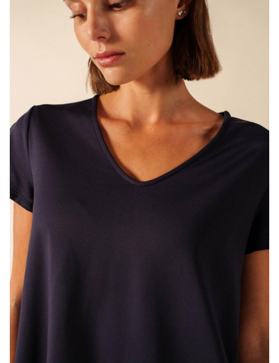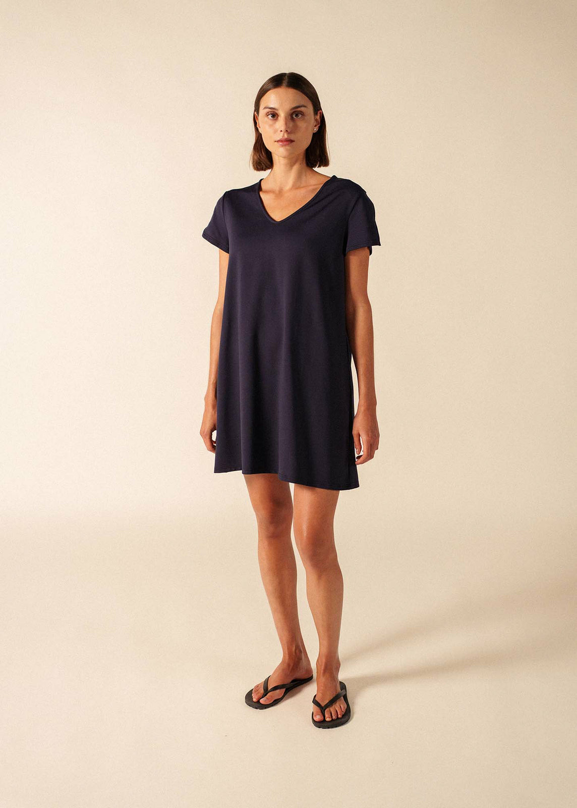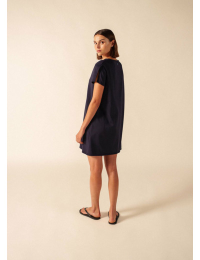 Pour ces journées où l'on veut profiter du plein soleil sans y penser, que ce soit pour un déjeuner en terrasse ou une promenade en bord de mer, la robe Vicq est une pièce qui rassure. Confectionnée en jersey, la même matière que notre marinière Propriano, elle intègre une protection anti-UV. Son encolure en V dégage le port de tête, tandis que les petites fentes sur les manches ajoutent un détail subtil et un peu d'aisance dans le mouvement. Sa coupe droite privilégie la simplicité, ce qui en fait une robe facile à vivre au quotidien. Elle est fabriquée en France, dans nos ateliers.