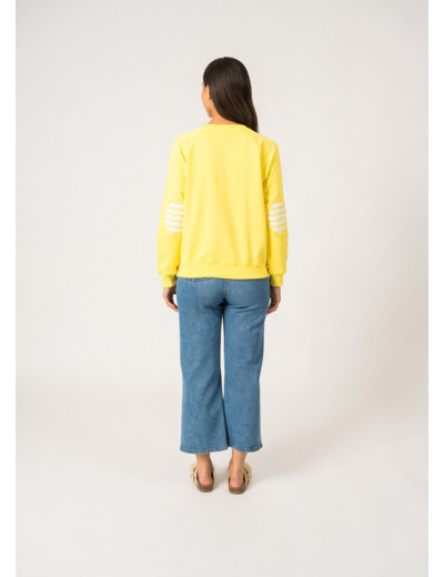 Indispensable du vestiaire casual, le sweat en coton se mêle cette saison à nos iconiques rayures marinières pour créer le modèle Fiona. Confectionné en molleton, il est doux et confortable. Aux manches, des coudières rayées rappellent nos indémodables rayures.