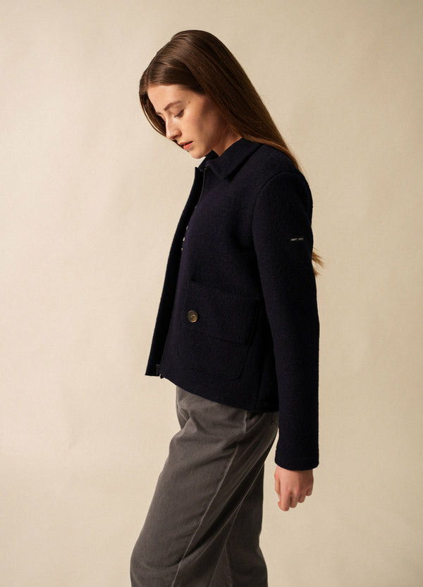Cette élégante veste en laine bouillie est façonnée avec expertise dans nos ateliers français à Saint-James. Son col fermé et sa fermeture zippée protègent des vents hivernaux et ses deux poches extérieurs vous permet de ranger vos petites affaires à porter de main. Une alliance parfaite entre savoir-faire et confort.
