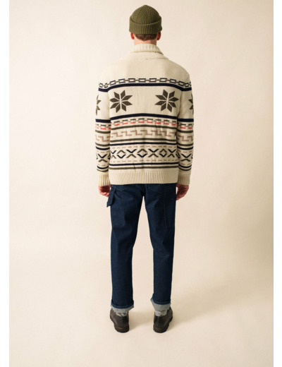 Pour un automne tout en douceur, découvrez la veste en laine Sion. Épaisse et chaude, elle est tricotée en jacquard ce qui lui donne ces motifs. Ses finitions bord-côte sur les manches, en bas du vêtement et sur le col apportent de la robustesse et du caractère à la pièce. Cette veste possède aussi des poches à l'avant et arbore des motifs western. - Veste maille