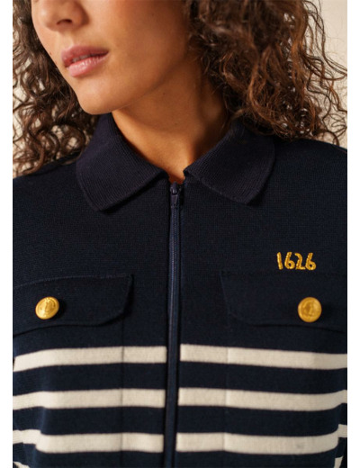 Une balade en front de mer lorsque le temps se rafraîchit, ou une soirée en ville qui demande une pièce plus chaude. Née de notre collaboration avec la Marine Nationale, la veste Richelieu rayée est confectionnée en 100% laine et propose une coupe ajustée. Son col polo zippé en point de Rome lui donne une structure nette, tandis que les détails rappellent son inspiration navale : des rabats de poches fermés par des boutons dorés, un curseur de fermeture éclair assorti, et la double broderie « 1626 » et « MN » au poignet. Cette veste est entièrement fabriquée dans nos ateliers en France.