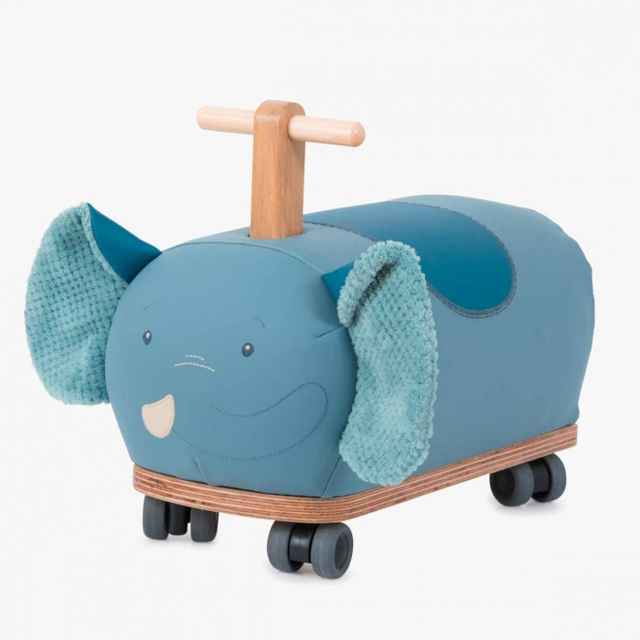Porteur éléphant à 4 roues folles, pour les tout-petits, en bois et simili cuir bleu. Sa trompe est brodée et l'intérieur de ses oreilles sont en fourrure toute douce.