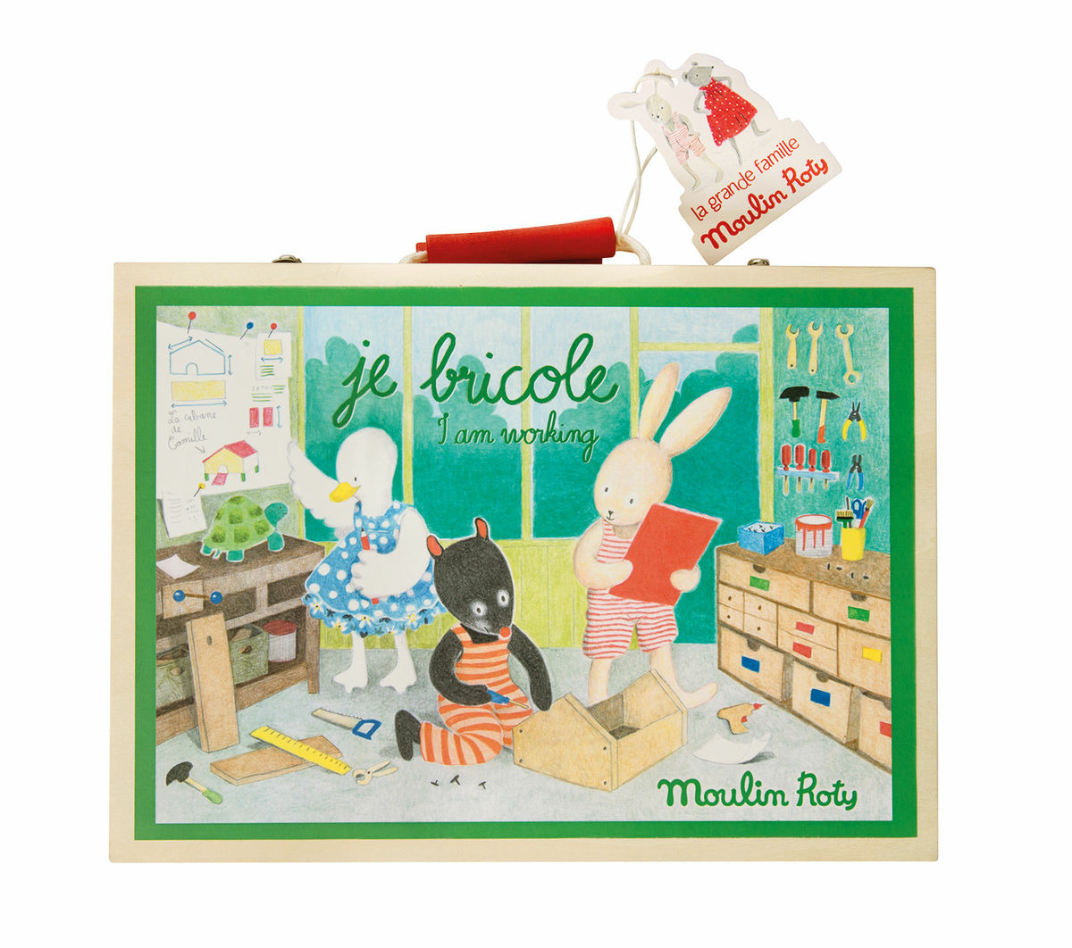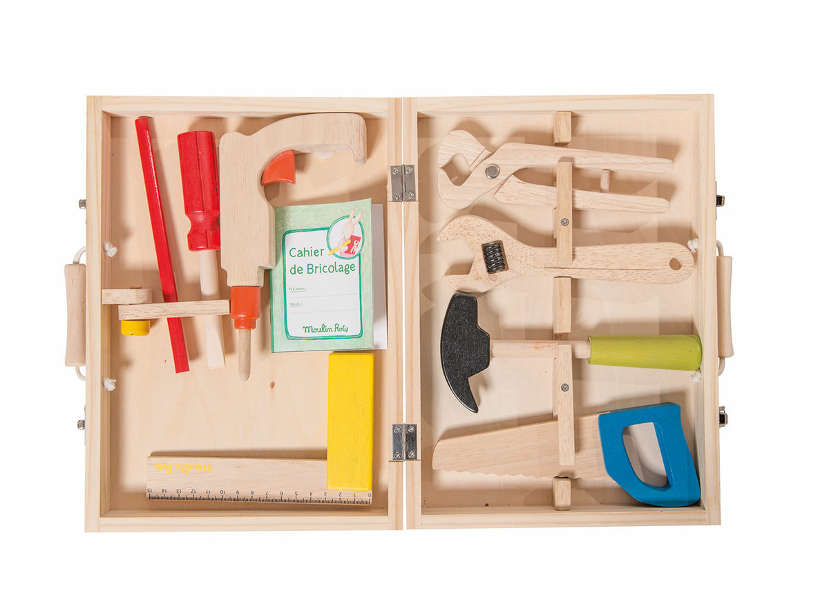 Valise à outils, établi de voyage en bois Moulin Roty, collection La Grande Famille.