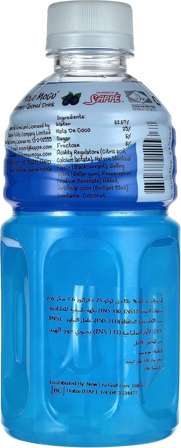 Mogu Mogu Cassis est une boisson rafraîchissante à la saveur exquise de Cassis. Ce délicieux parfum est associé à la nata de coco pour donner une sensation exquise une fois en bouche. La nata de noix de coco est un savoureux cube de gelée de jus de coco. Elle est d’origine philippine et contribue donc au goût exceptionnel de ces “soft drinks”. Aimez-vous les nouvelles sensations ? Vous allez sans doute craquer pour cette délicieuse boisson avec son croquant de cubes de nata de coco et son bon goût de cassis. Les boissons Mogu Mogu sont rafraîchissantes et agréables à boire. Les enfants et les adultes les adorent ! Mogu Mogu Cassis : Eau, jus de cassis, nata de coco, sucre, acide acétique, fructose, saccharose, tartrazine, bleu brillant FCF, acide citrique, arôme de cassis, benzoate de sodium