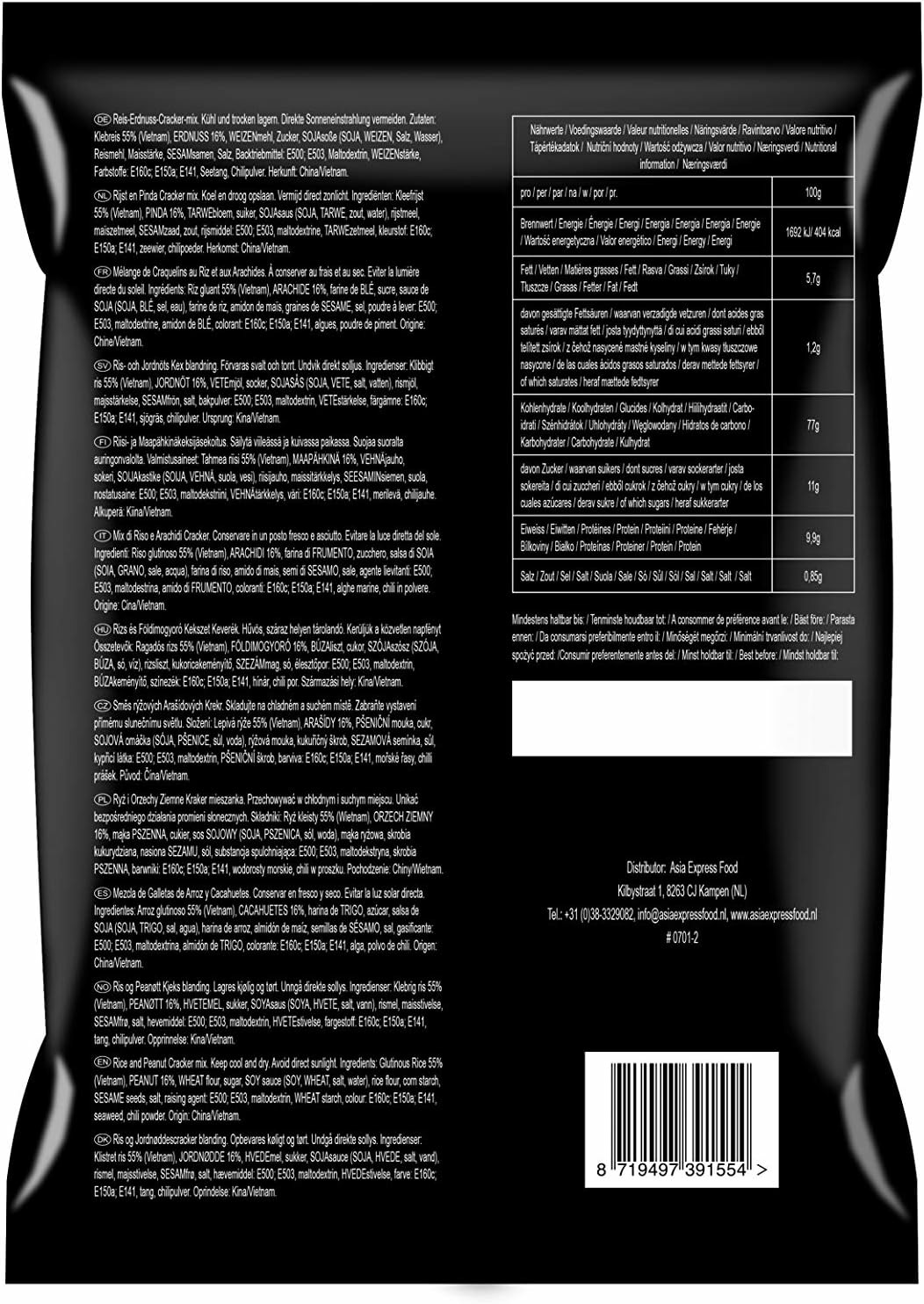 Riz 55%, ARACHIDE 16%, farine de BLE, sucre, sauce de SOJA (SOJA, BLE, sel), farine de riz 3%, amidon de maïs, SESAME, poudre à lever: E500ii; E503ii, sel, maltodextrine, amidon de BLE, colorants: E150a; E160c; E141i, algues, piment poudre.