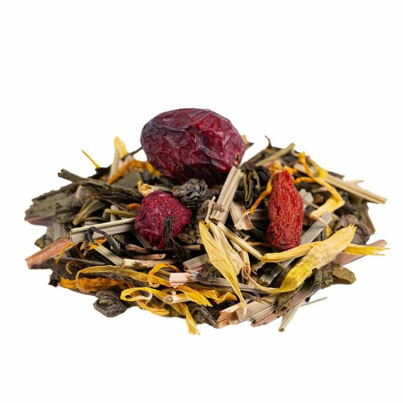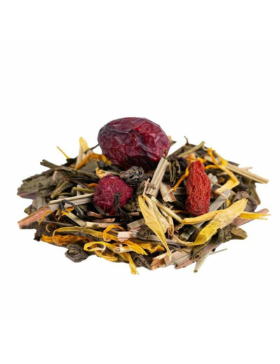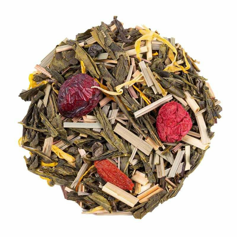 Thé vert China Sencha (47%), citronnelle, thé vert China Gunpowder, Green Putharjhora, amarante (6%), fleurs de sureau, arôme naturel, thé blanc Mao Feng, graines de chia, framboise, baie de goji, aronia, canneberge, souci, reine des prés (1%), acerola, galanga, açai, herbe de blé, guarana. Mélange premium élaboré avec des ingrédients issus de l'agriculture durable et des arômes naturels.