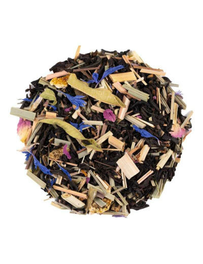 Thé noir Assam-Inde du Sud, citronnelle, thé noir Assam OP, thé noir Golden Yunnan OP, arôme naturel, écorces d'orange, écorces de citron, verveine entière, pétales de rose, fleurs de bleuet, arôme naturel d'orange.