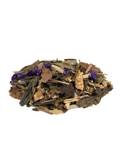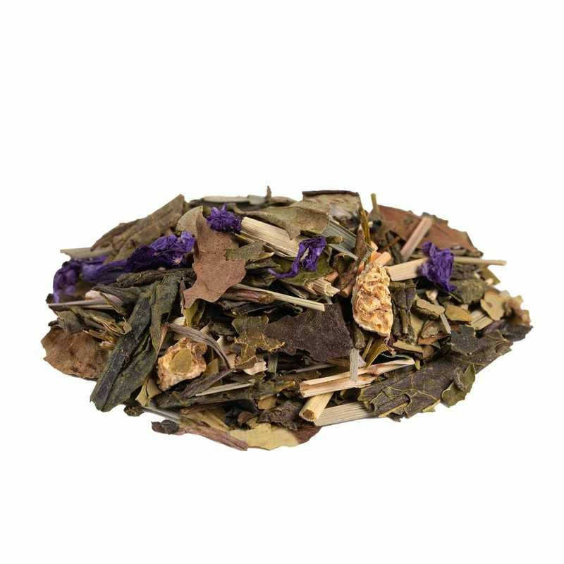 Thé vert China Sencha, maté vert, citronnelle (16%), thé blanc Pai Mu Tan, ortie, écorces de citron (9%), arôme naturel, coco , feuilles de moringa, mauve.