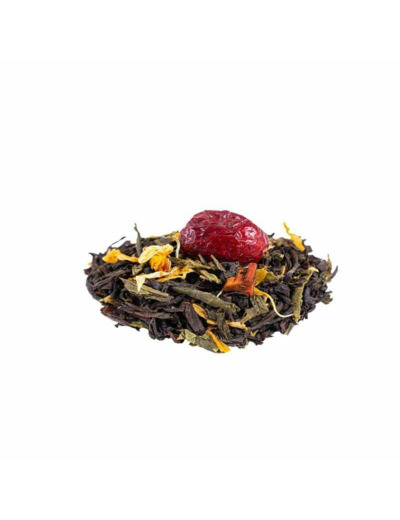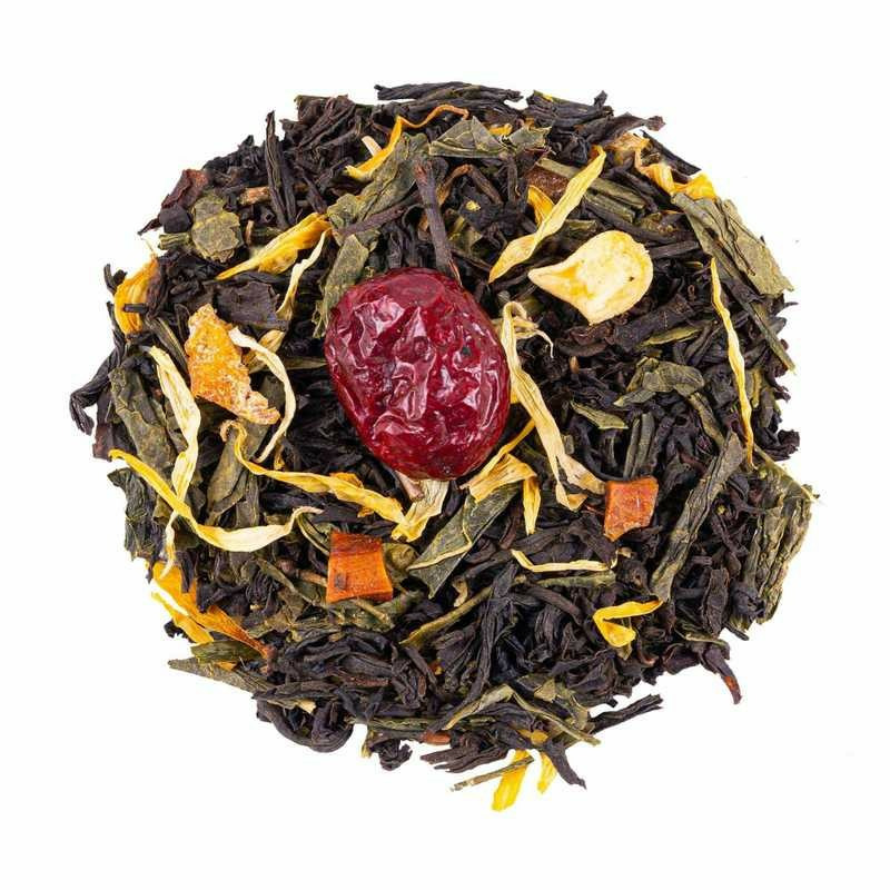 Thé noir Assam, -Inde du Sud, thé vert China Sencha, arôme naturel, morceaux de mangue, papaye, canneberge, souci, mangue, arôme naturel d'orange.