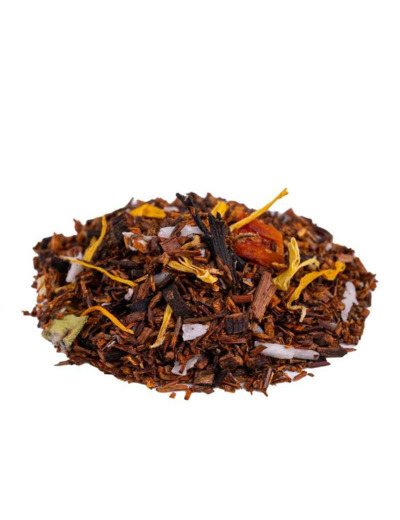 Rooibos naturel, Honeybush, coco, arôme naturel, morceaux de mangue, papaye, ananas, fleurs de souci.